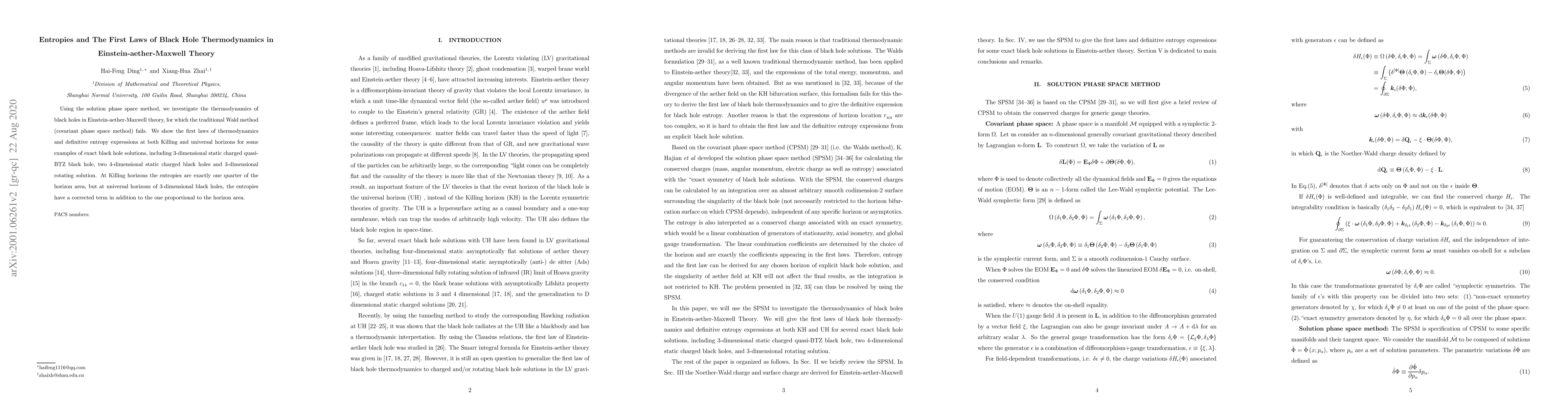This paper investigates the thermodynamics of black holes in Einstein-aether-Maxwell theory using the solution phase space method, revealing the first laws of black hole thermodynamics and entropy expressions at Killing and universal horizons for various exact black hole solutions. Entropies at Killing horizons are proportional to one quarter of the horizon area, while at universal horizons, additional corrected terms appear.