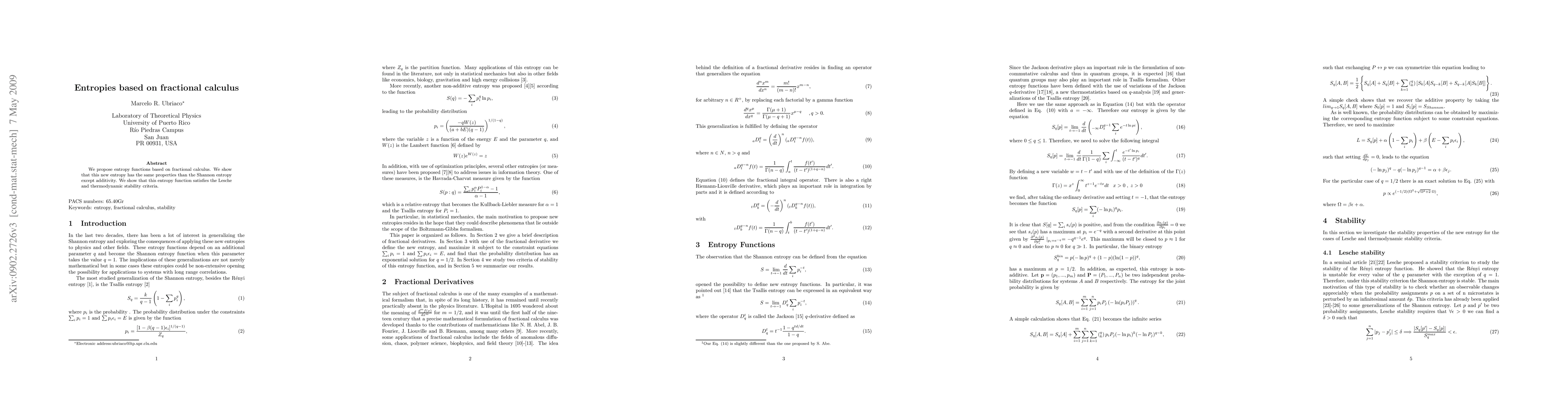 We propose entropy functions based on fractional calculus. We show that this new entropy has the same properties than the Shannon entropy except additivity, therefore making this entropy non-extensive. We show that this entropy function satisfies the Lesche and thermodynamic stability criteria.