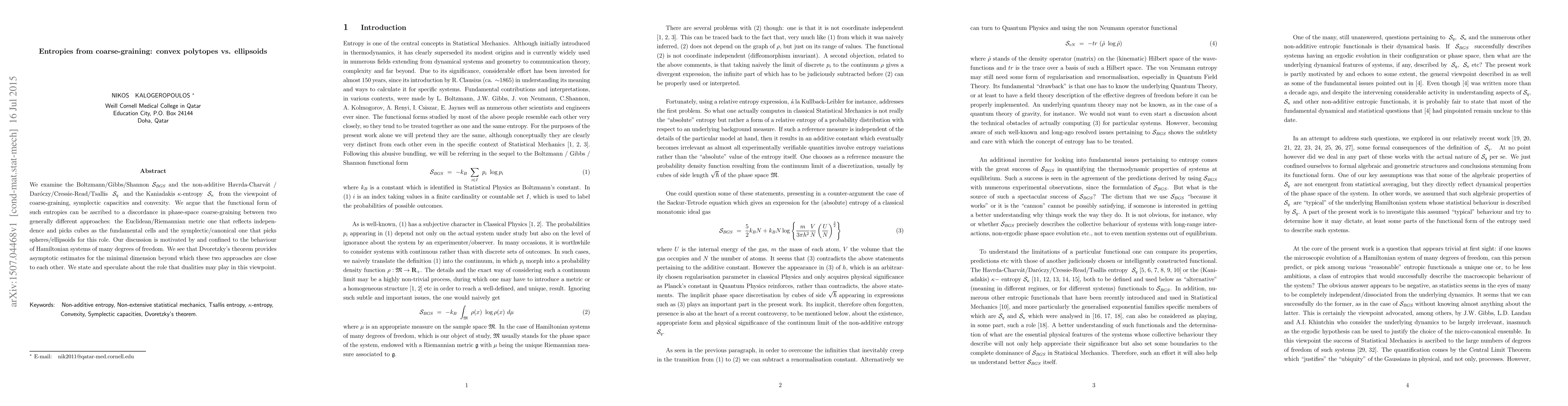 We examine the Boltzmann/Gibbs/Shannon $\mathcal{S}_{BGS}$ and the non-additive Havrda-Charv\'{a}t / Dar\'{o}czy/Cressie-Read/Tsallis \ $\mathcal{S}_q$ \ and the Kaniadakis $\kappa$-entropy \ $\mathcal{S}_\kappa$ \ from the viewpoint of coarse-graining, symplectic capacities and convexity. We argue that the functional form of such entropies can be ascribed to a discordance in phase-space coarse-graining between two generally different approaches: the Euclidean/Riemannian metric one that reflects independence and picks cubes as the fundamental cells and the symplectic/canonical one that picks spheres/ellipsoids for this role. Our discussion is motivated by and confined to the behaviour of Hamiltonian systems of many degrees of freedom. We see that Dvoretzky's theorem provides asymptotic estimates for the minimal dimension beyond which these two approaches are close to each other. We state and speculate about the role that dualities may play in this viewpoint.