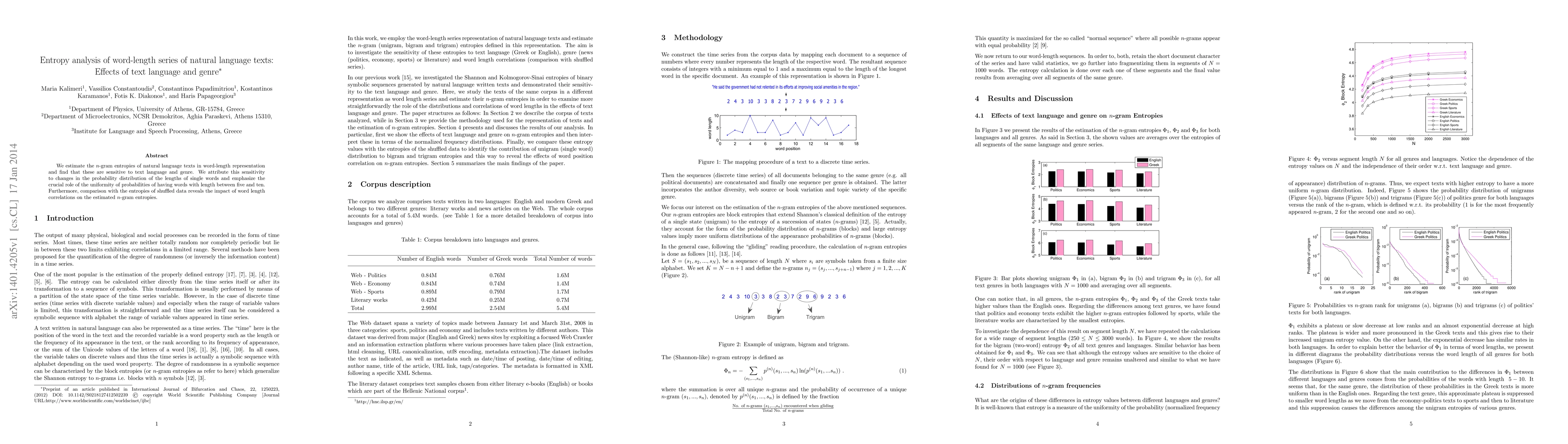 This study analyzes $n$-gram entropies of natural language texts to reveal sensitivity to text language and genre, attributing this to variations in word length probability distributions and highlighting the importance of uniform probabilities for words of length five to ten. Entropy comparisons with shuffled data show the influence of word length correlations.