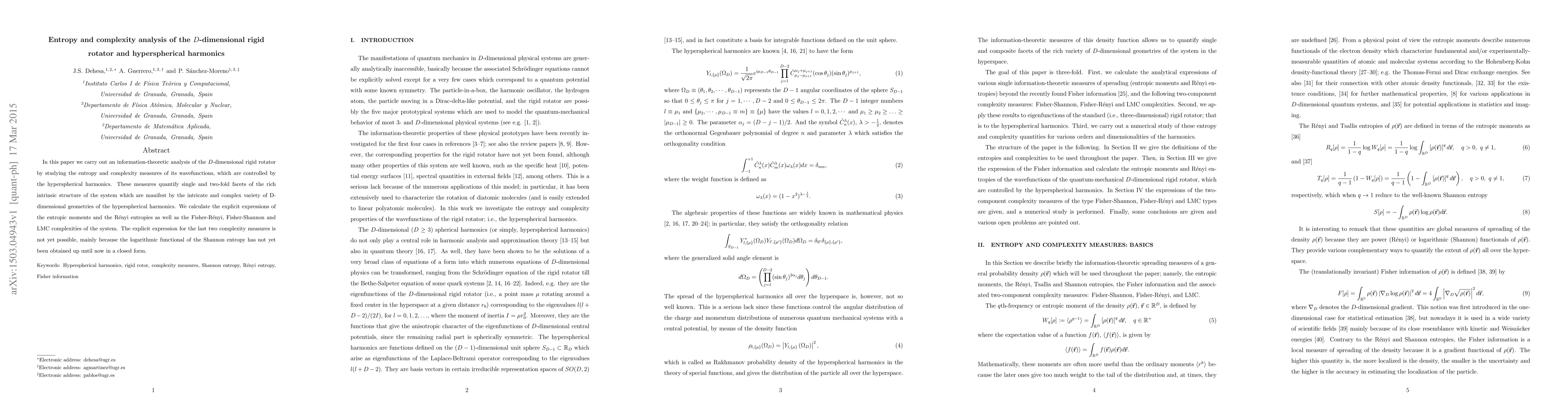 In this paper we carry out an information-theoretic analysis of the $D$-dimensional rigid rotator by studying the entropy and complexity measures of its wavefunctions, which are controlled by the hyperspherical harmonics. These measures quantify single and two-fold facets of the rich intrinsic structure of the system which are manifest by the intricate and complex variety of D-dimensional geometries of the hyperspherical harmonics. We calculate the explicit expressions of the entropic moments and the R\'enyi entropies as well as the Fisher-R\'enyi, Fisher-Shannon and LMC complexities of the system. The explicit expression for the last two complexity measures is not yet possible, mainly because the logarithmic functional of the Shannon entropy has not yet been obtained up until now in a closed for