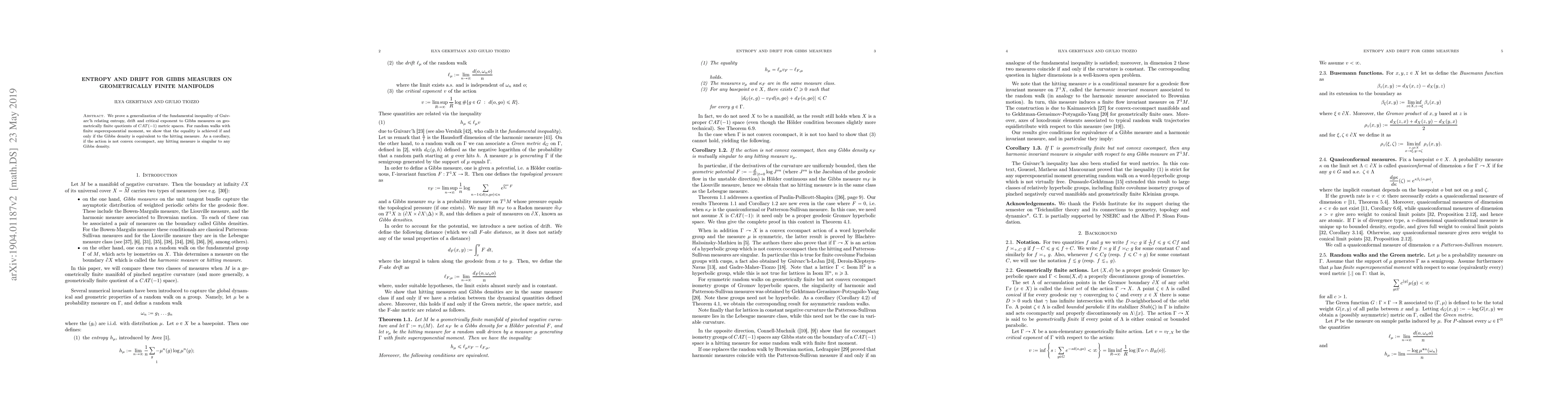 This paper generalizes Guivarc'h's inequality for entropy, drift, and critical exponent in relation to Gibbs measures on geometrically finite quotients of CAT(-1) spaces. It demonstrates that equality in this inequality holds if and only if the Gibbs density is equivalent to the hitting measure, with a corollary showing that non-convex cocompact actions result in singular hitting measures relative to Gibbs densities.