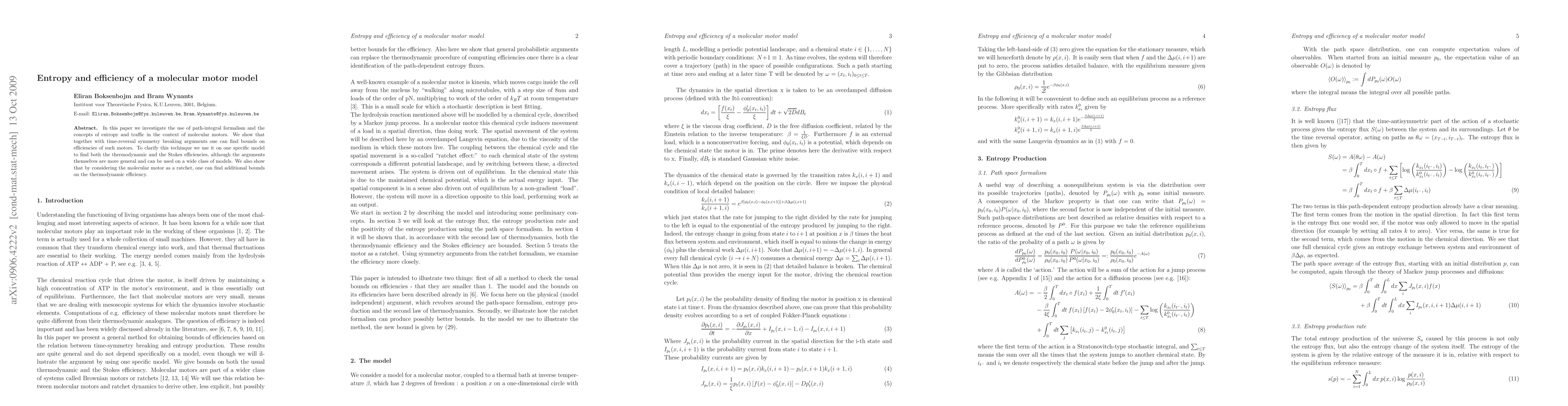 This paper employs path-integral formalism and entropy concepts to analyze molecular motor efficiency, deriving bounds on efficiencies using time-reversal symmetry breaking. It applies these techniques to a specific model to determine thermodynamic and Stokes efficiencies, demonstrating broader applicability to various motor models.