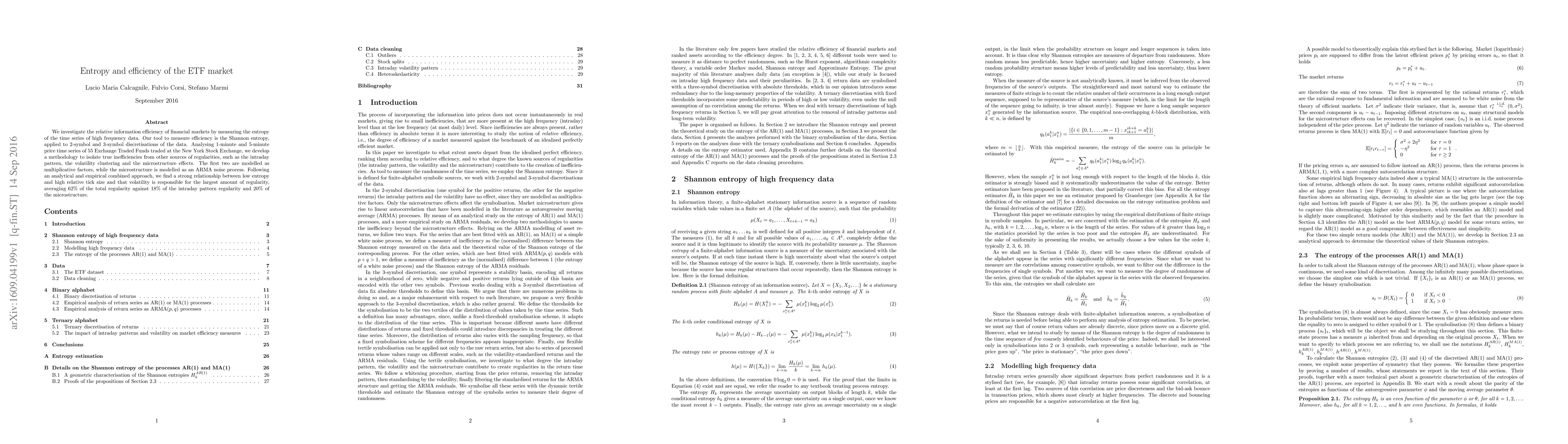We investigate the relative information efficiency of financial markets by measuring the entropy of the time series of high frequency data. Our tool to measure efficiency is the Shannon entropy, applied to 2-symbol and 3-symbol discretisations of the data. Analysing 1-minute and 5-minute price time series of 55 Exchange Traded Funds traded at the New York Stock Exchange, we develop a methodology to isolate true inefficiencies from other sources of regularities, such as the intraday pattern, the volatility clustering and the microstructure effects. The first two are modelled as multiplicative factors, while the microstructure is modelled as an ARMA noise process. Following an analytical and empirical combined approach, we find a strong relationship between low entropy and high relative tick size and that volatility is responsible for the largest amount of regularity, averaging 62% of the total regularity against 18% of the intraday pattern regularity and 20% of the microstructure.