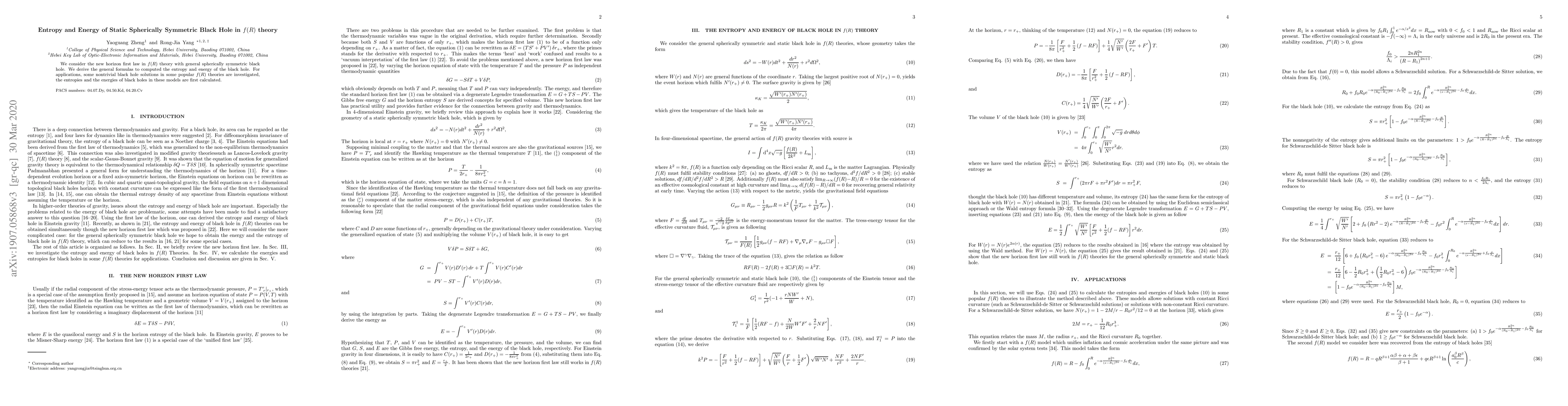 This paper derives general formulas for the entropy and energy of static spherically symmetric black holes in $f(R)$ gravity, applying the new horizon first law. It calculates the entropy and energy for specific nontrivial black hole solutions in popular $f(R)$ models.