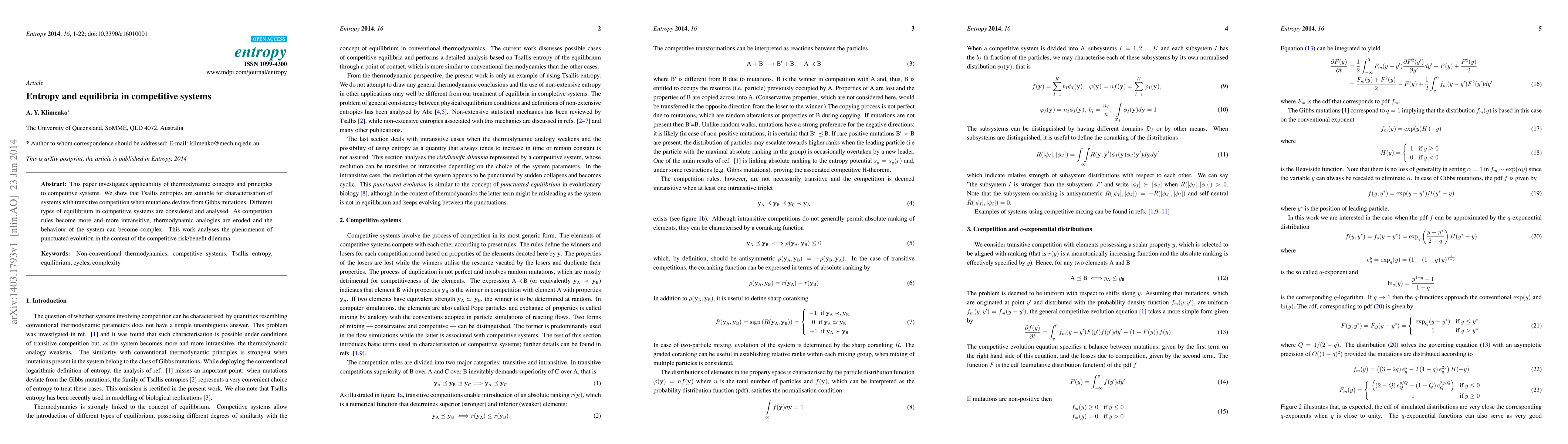 This paper investigates applicability of thermodynamic concepts and principles to competitive systems. We show that Tsallis entropies are suitable for characterisation of systems with transitive competition when mutations deviate from Gibbs mutations. Different types of equilibrium in competitive systems are considered and analysed. As competition rules become more and more intransitive, thermodynamic analogies are eroded and the behaviour of the system can become complex. This work analyses the phenomenon of punctuated evolution in the context of the competitive risk/benefit dilemma.