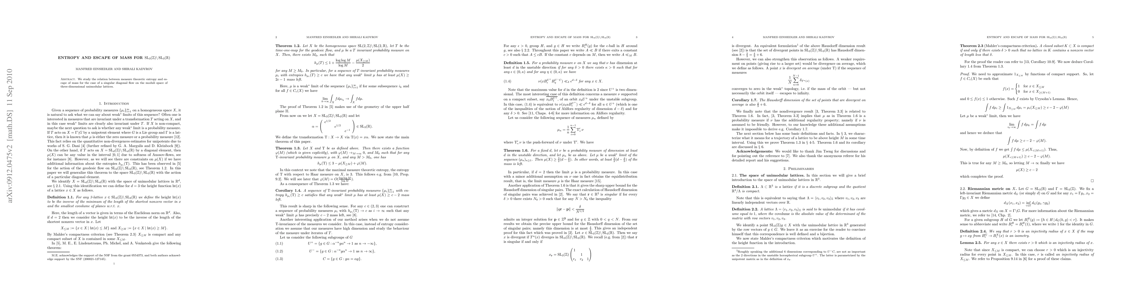 Summary: This paper investigates the connection between measure theoretic entropy and mass escape dynamics for a singular diagonal flow on the moduli space of three-dimensional unimodular lattices. The focus is on understanding how entropy influences the behavior of mass distribution under this flow.