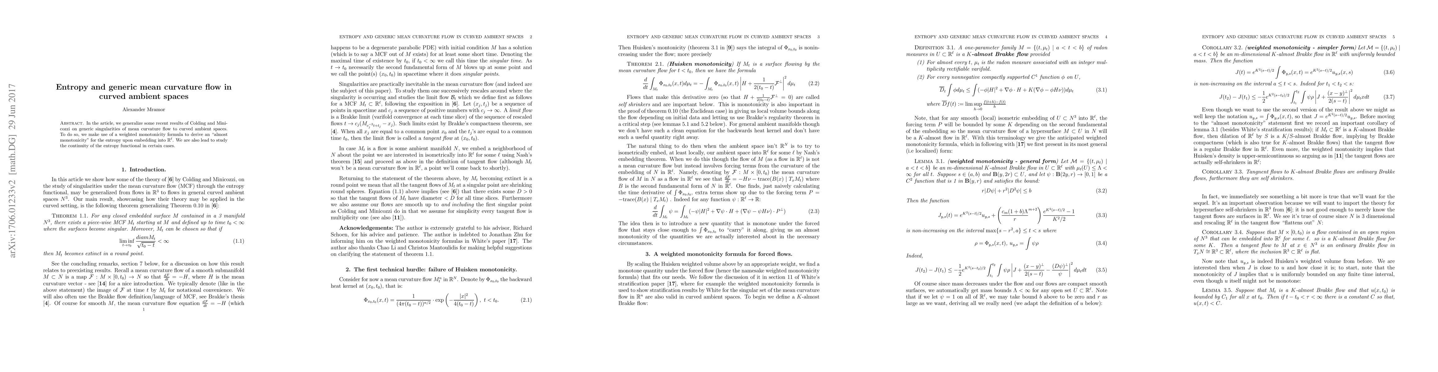 Researchers generalize Colding and Minicozzi's results on mean curvature flow to curved ambient spaces, using a weighted monotonicity formula to derive properties of entropy in these spaces.