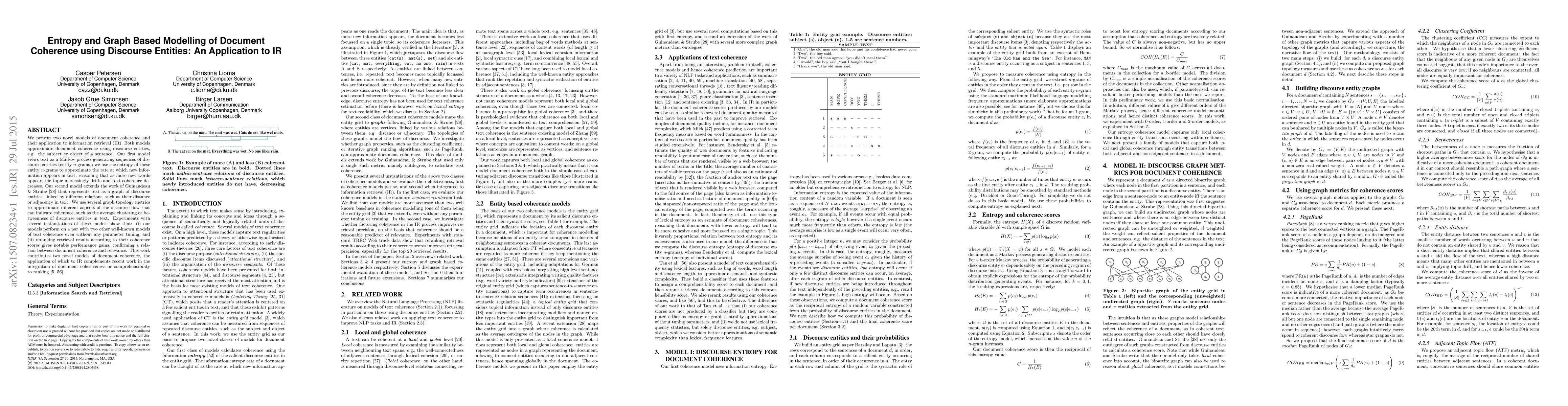 This paper introduces two novel models for assessing document coherence using discourse entities, applying entropy to entity n-grams and graph topology metrics to discourse entity graphs. The models show comparable performance to existing coherence measures and improve information retrieval relevance when reranking results based on coherence scores.