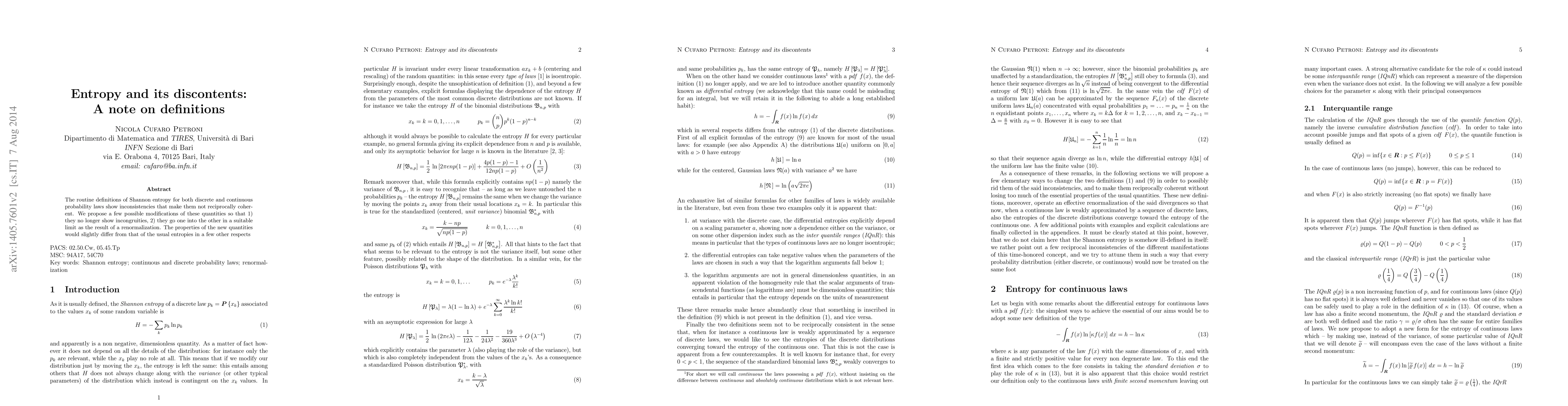 The routine definitions of both entropy, and differential entropy show inconsistencies that make them not reciprocally coherent. We propose a few possible modifications of these quantities so that 1) they no longer show incongruities, 2) they go one into the other in a suitable limit as the result of a renormalization. The properties of the new quantities would slightly differ from that of the usual entropies in a few other respects