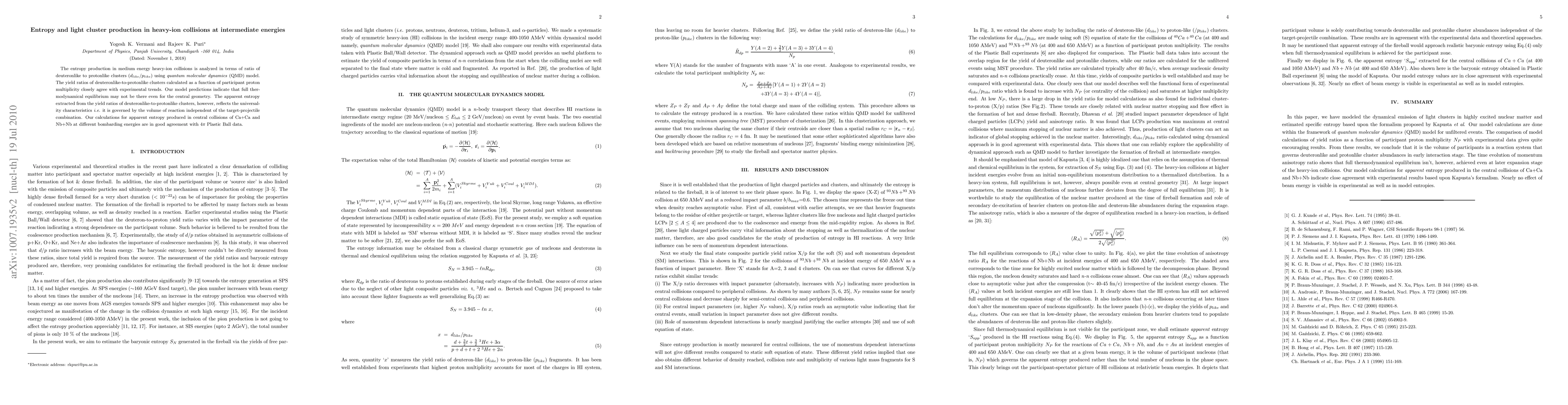 The entropy production in medium energy heavy-ion collisions is analyzed in terms of ratio of deuteronlike to protonlike clusters ($d_{like}/p_{like}$) using \emph{quantum molecular dynamics} (QMD) model. The yield ratios of deuteronlike-to-protonlike clusters calculated as a function of participant proton multiplicity closely agree with experimental trends. Our model predictions indicate that full thermodynamical equilibrium may not be there even for the central geometry. The apparent entropy extracted from the yield ratios of deuteronlike-to-protonlike clusters, however, reflects the universality characteristics \emph{i.e.} it is governed by the volume of reaction independent of the target-projectile combination. Our calculations for apparent entropy produced in central collisions of Ca+Ca and Nb+Nb at different bombarding energies are in good agreement with $4\pi$ Plastic Ball data.