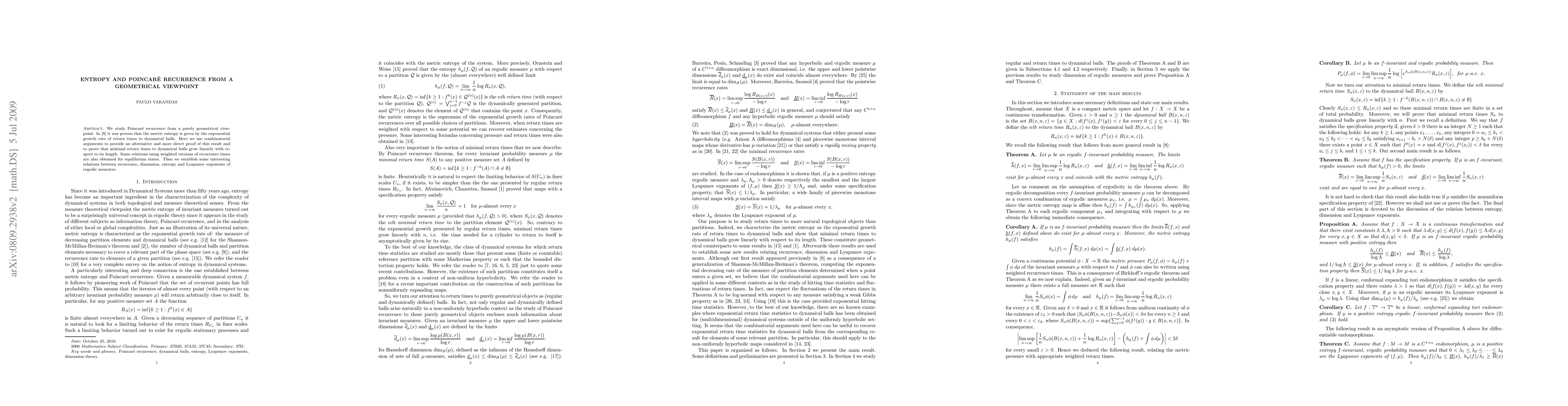 This paper explores Poincaré recurrence through a geometrical lens, proving that metric entropy corresponds to the exponential growth rate of return times to dynamical balls, akin to the Ornstein-Weiss theorem. It also demonstrates linear growth of minimal return times with respect to ball length and discusses connections between recurrence, dimension, entropy, and Lyapunov exponents of ergodic measures.