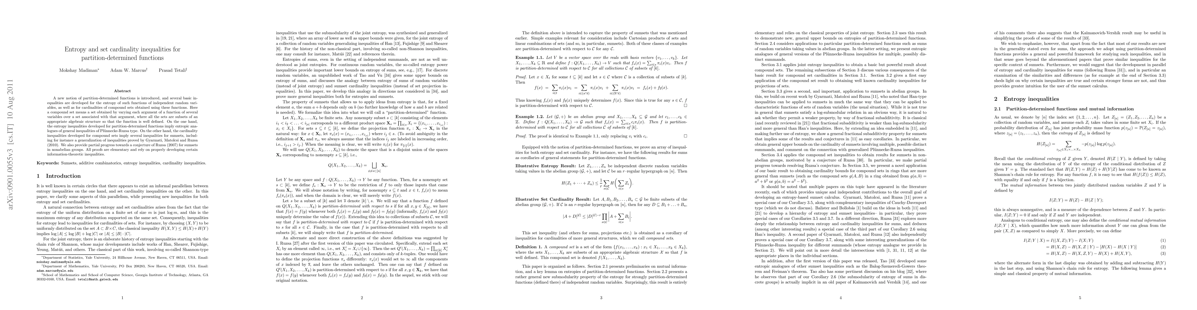This paper introduces partition-determined functions and develops entropy and cardinality inequalities for them, including entropic analogues of Plünnecke-Ruzsa type inequalities and generalizations of sumset inequalities. The proofs are elementary and utilize information-theoretic techniques.
