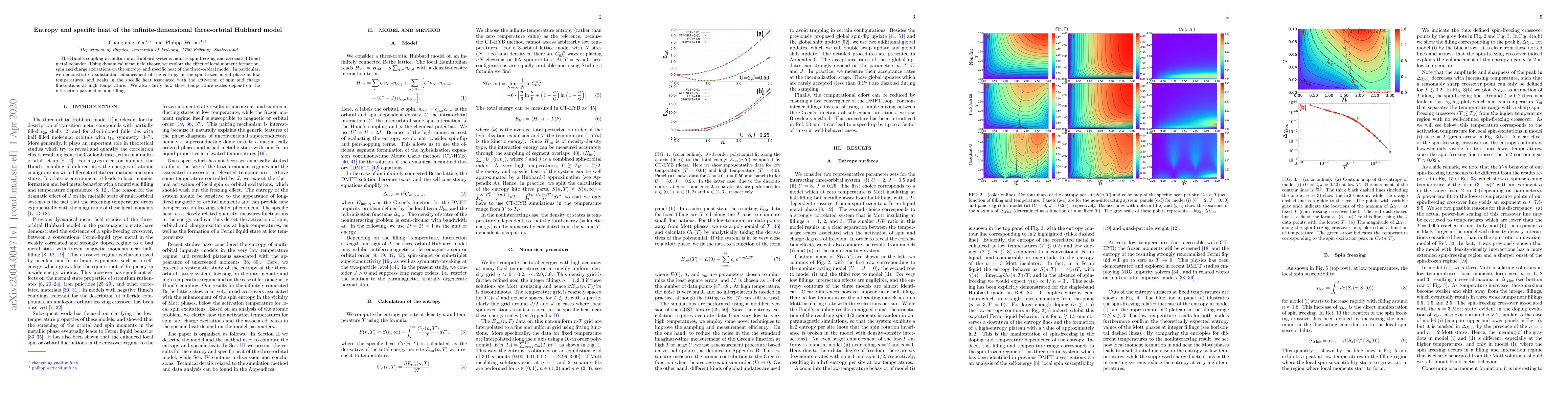 This study uses dynamical mean field theory to investigate the entropy and specific heat of the three-orbital Hubbard model, revealing significant entropy enhancement in the spin-frozen metal phase at low temperatures and specific heat peaks due to spin and charge fluctuations at high temperatures, with temperature scales dependent on interaction parameters and filling.