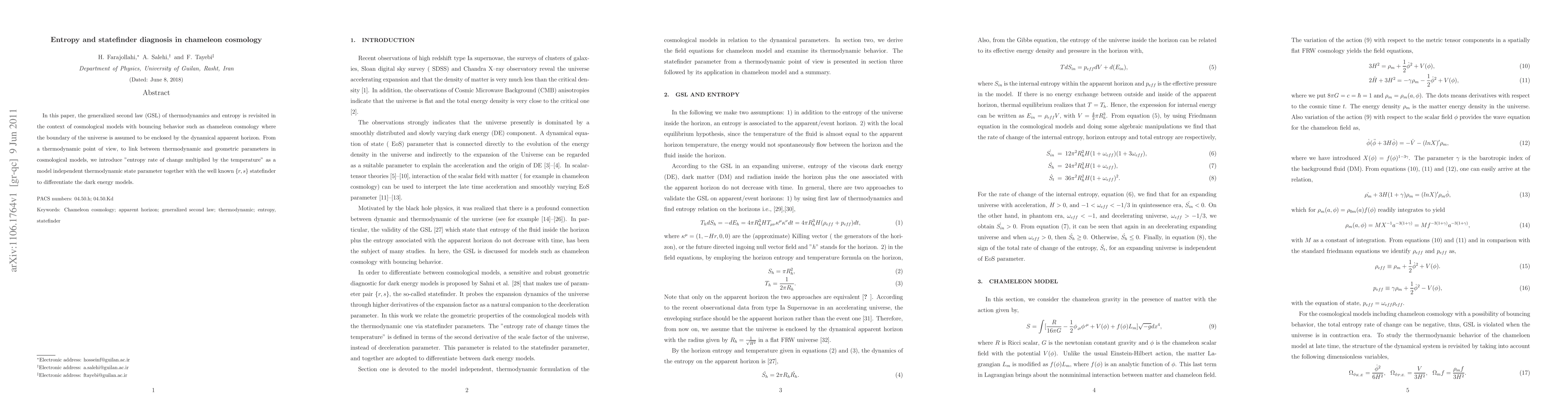 In this paper, the generalized second law (GSL) of thermodynamics and entropy is revisited in the context of cosmological models with bouncing behavior such as chameleon cosmology where the boundary of the universe is assumed to be enclosed by the dynamical apparent horizon. From a thermodynamic point of view, to link between thermodynamic and geometric parameters in cosmological models, we introduce "entropy rate of change multiplied by the temperature" as a model independent thermodynamic state parameter together with the well known $\{r,s \}$ statefinder to differentiate the dark energy models.