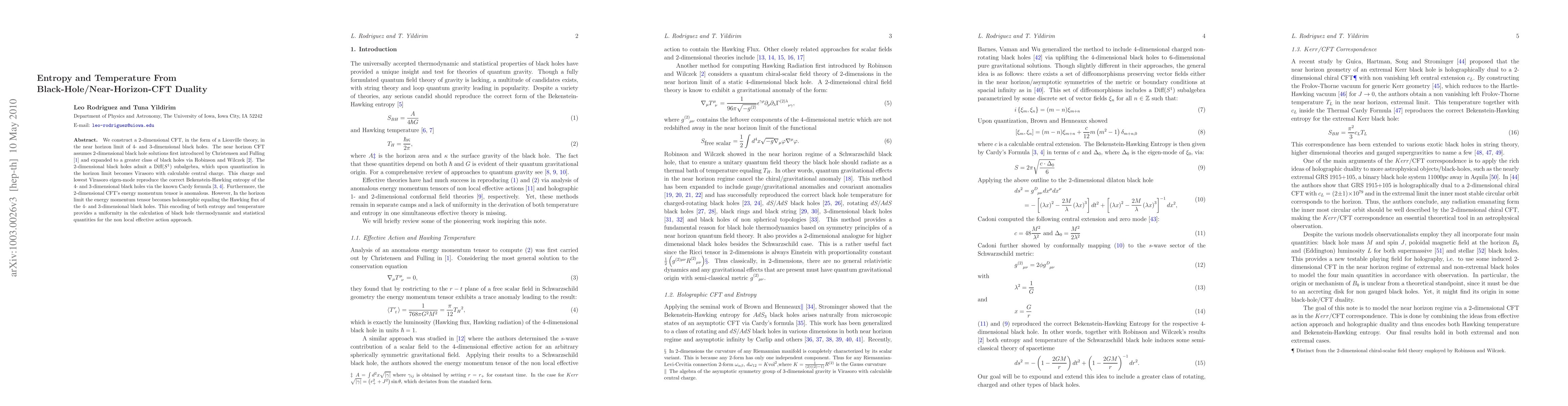 We construct a 2-dimensional CFT, in the form of a Liouville theory, in the near horizon limit of 4- and 3-dimensional black holes. The near horizon CFT assumes 2-dimensional black hole solutions first introduced by Christensen and Fulling and expanded to a greater class of black holes via Robinson and Wilczek. The 2-dimensional black holes admit a Diff($S^1$) subalgebra, which upon quantization in the horizon limit becomes Virasoro with calculable central charge. This charge and lowest Virasoro eigen-mode reproduce the correct Bekenstein-Hawking entropy of the 4- and 3-dimensional black holes via the known Cardy formula. Furthermore, the 2-dimensional CFT's energy momentum tensor is anomalous. However, In the horizon limit the energy momentum tensor becomes holomorphic equaling the Hawking flux of the 4- and 3-dimensional black holes. This encoding of both entropy and temperature provides a uniformity in the calculation of black hole thermodynamic and statistical quantities for the non local effective action approach.