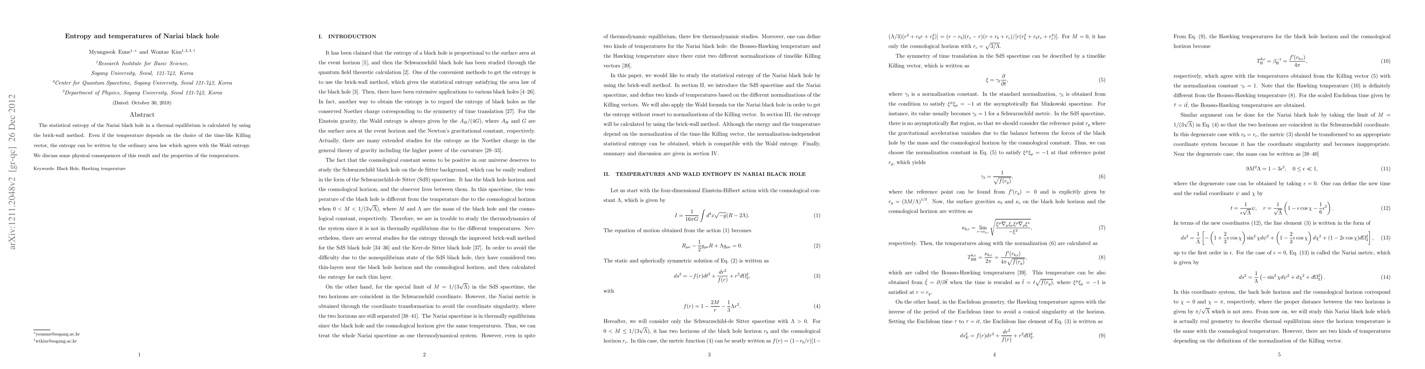 The statistical entropy of the Nariai black hole in a thermal equilibrium is calculated by using the brick-wall method. Even if the temperature depends on the choice of the time-like Killing vector, the entropy can be written by the ordinary area law which agrees with the Wald entropy. We discuss some physical consequences of this result and the properties of the temperatures.