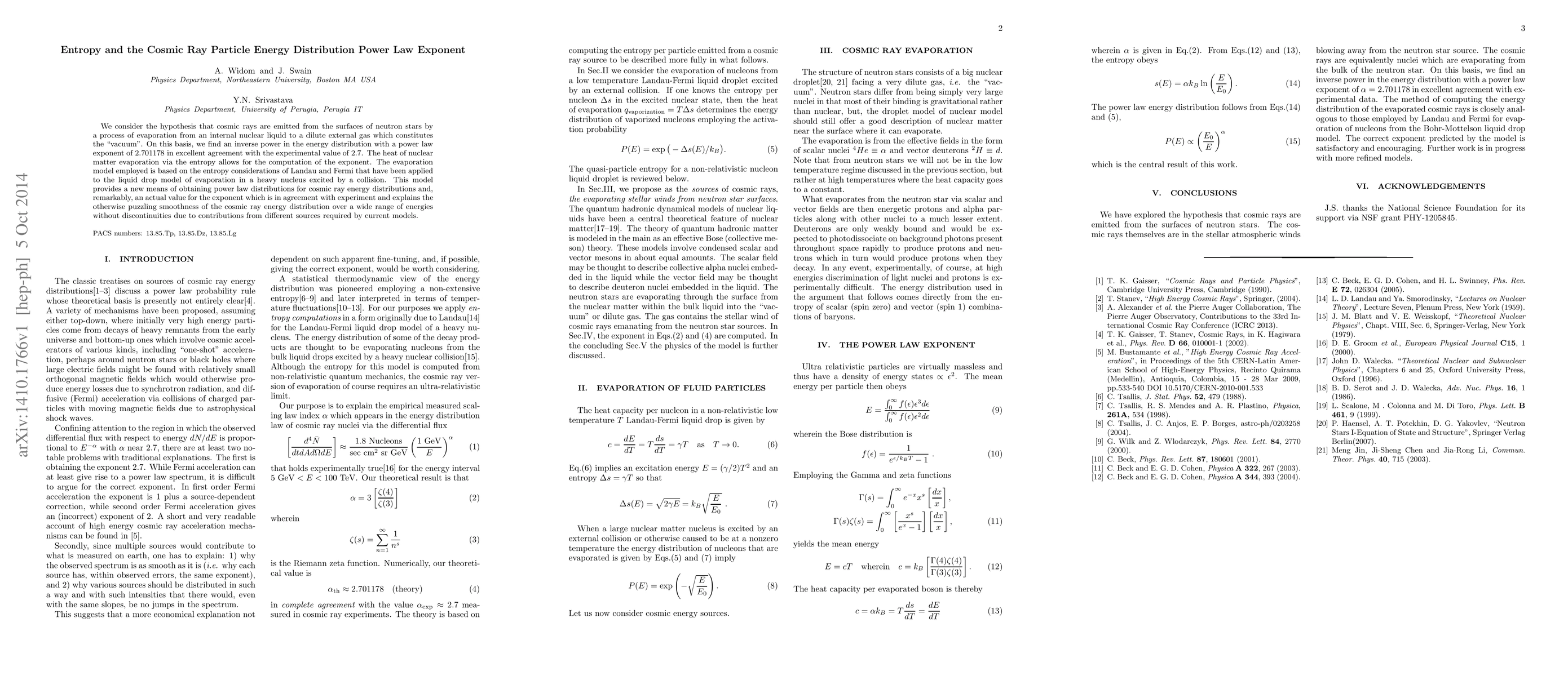 We consider the hypothesis that cosmic rays are emitted from the surfaces of neutron stars by a process of evaporation from an internal nuclear liquid to a dilute external gas which constitutes the "vacuum". On this basis, we find an inverse power in the energy distribution with a power law exponent of 2.701178 in excellent agreement with the experimental value of 2.7. The heat of nuclear matter evaporation via the entropy allows for the computation of the exponent. The evaporation model employed is based on the entropy considerations of Landau and Fermi that have been applied to the liquid drop model of evaporation in a heavy nucleus excited by a collision. This model provides a new means of obtaining power law distributions for cosmic ray energy distributions and, remarkably, an actual value for the exponent which is in agreement with experiment and explains the otherwise puzzling smoothness of the cosmic ray energy distribution over a wide range of energies without discontinuities due to contributions from different sources required by current models.
