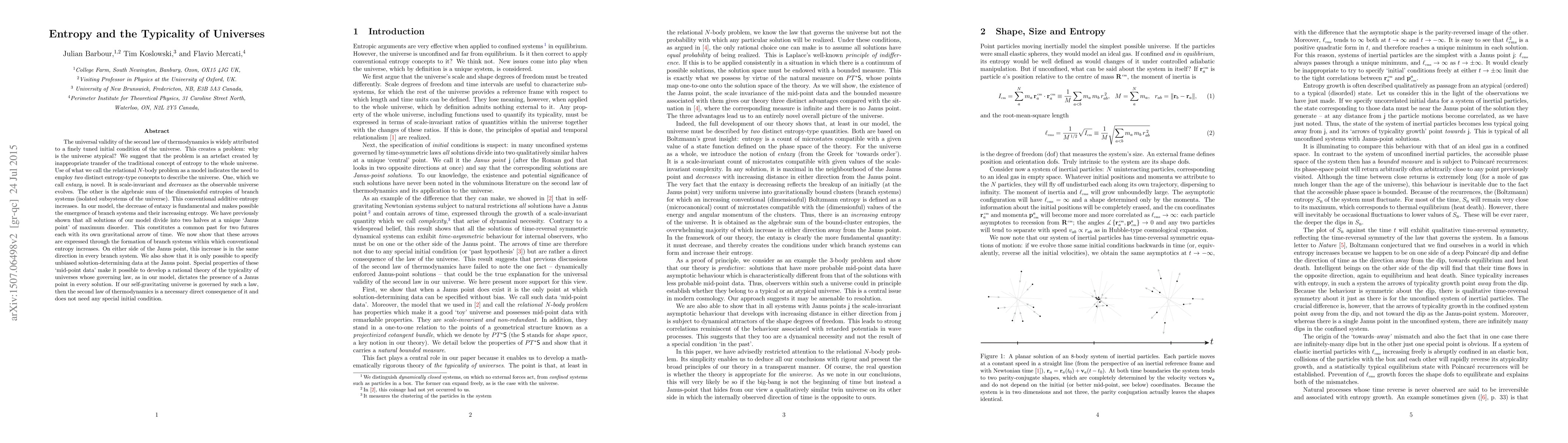 The universal validity of the second law of thermodynamics is widely attributed to a finely tuned initial condition of the universe. This creates a problem: why is the universe atypical? We suggest that the problem is an artefact created by inappropriate transfer of the traditional concept of entropy to the whole universe. Use of what we call the relational $N$-body problem as a model indicates the need to employ two distinct entropy-type concepts to describe the universe. One, which we call entaxy, is novel. It is scale-invariant and decreases as the observable universe evolves. The other is the algebraic sum of the dimensionful entropies of branch systems (isolated subsystems of the universe). This conventional additive entropy increases. In our model, the decrease of entaxy is fundamental and makes possible the emergence of branch systems and their increasing entropy. We have previously shown that all solutions of our model divide into two halves at a unique `Janus point' of maximum disorder. This constitutes a common past for two futures each with its own gravitational arrow of time. We now show that these arrows are expressed through the formation of branch systems within which conventional entropy increases. On either side of the Janus point, this increase is in the same direction in every branch system. We also show that it is only possible to specify unbiased solution-determining data at the Janus point. Special properties of these `mid-point data' make it possible to develop a rational theory of the typicality of universes whose governing law, as in our model, dictates the presence of a Janus point in every solution. If our self-gravitating universe is governed by such a law, then the second law of thermodynamics is a necessary direct consequence of it and does not need any special initial condition.