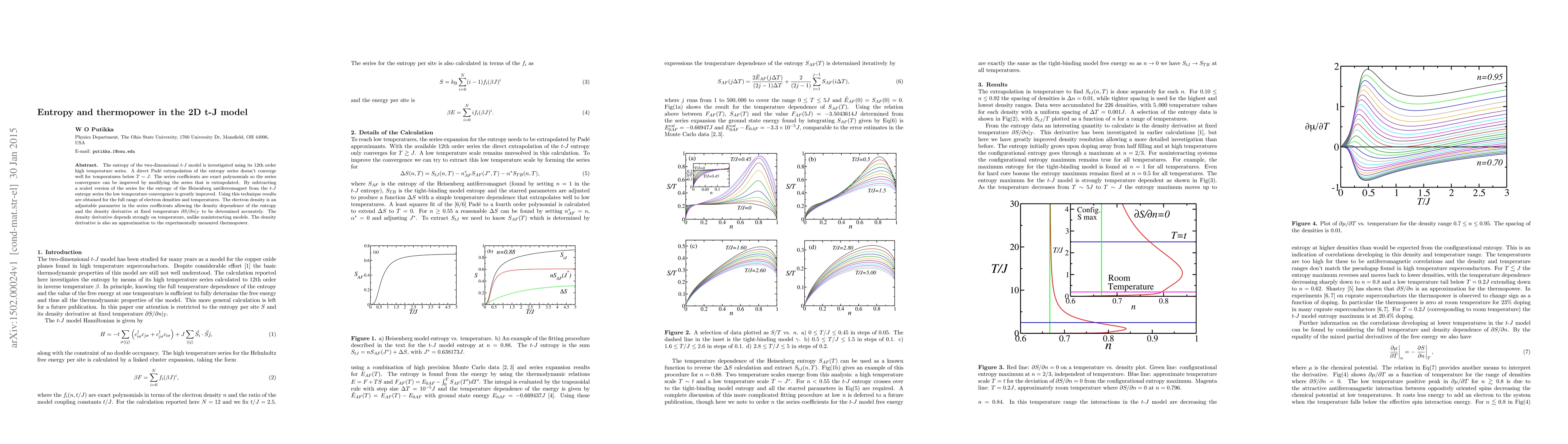 The entropy of the two-dimensional $t$-$J$ model is investigated using its 12th order high temperature series. A direct Pad\'{e} extrapolation of the entropy series doesn't converge well for temperatures below $T\sim J$. The series coefficients are exact polynomials so the series convergence can be improved by modifying the series that is extrapolated. By subtracting a scaled version of the series for the entropy of the Heisenberg antiferromagnet from the $t$-$J$ entropy series the low temperature convergence is greatly improved. Using this technique results are obtained for the full range of electron densities and temperatures. The electron density is an adjustable parameter in the series coefficients allowing the density dependence of the entropy and the density derivative at fixed temperature $\partial S/\partial n|_T$ to be determined accurately. The density derivative depends strongly on temperature, unlike noninteracting models. The density derivative is also an approximation to the experimentally measured thermopower.