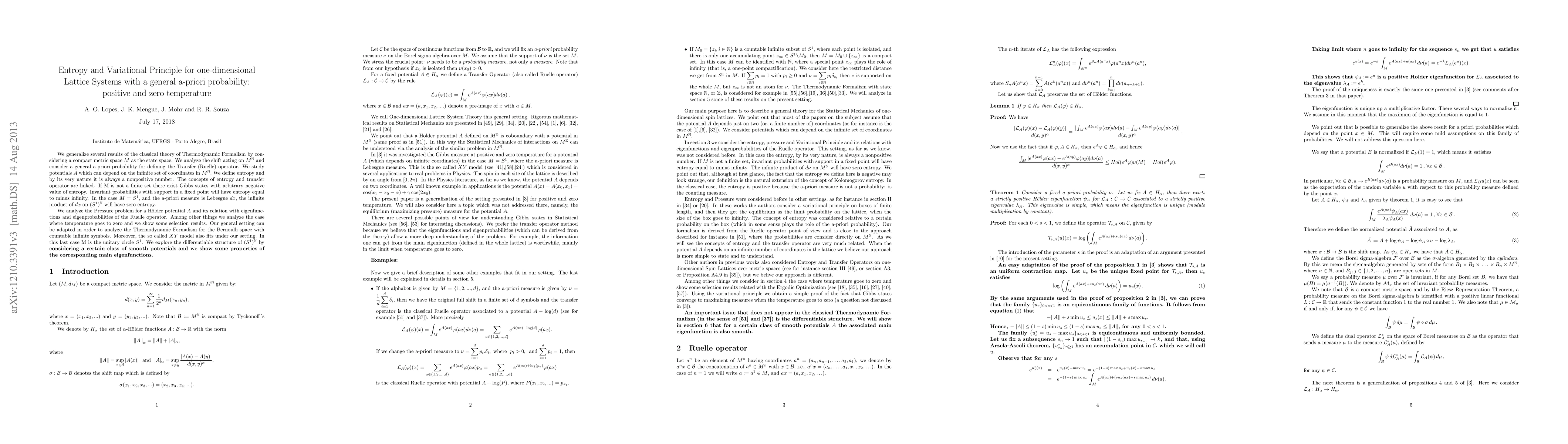 We generalize several results of the classical theory of Thermodynamic Formalism by considering a compact metric space $M$ as the state space. We analyze the shift acting on $M^\mathbb{N}$ and consider a general a-priori probability for defining the Transfer (Ruelle) operator. We study potentials $A$ which can depend on the infinite set of coordinates in $M^\mathbb{N}.$ We define entropy and by its very nature it is always a nonpositive number. The concepts of entropy and transfer operator are linked. If M is not a finite set there exist Gibbs states with arbitrary negative value of entropy. Invariant probabilities with support in a fixed point will have entropy equal to minus infinity. In the case $M=S^1$, and the a-priori measure is Lebesgue $dx$, the infinite product of $dx$ on $(S^1)^\mathbb{N}$ will have zero entropy. We analyze the Pressure problem for a H\"older potential $A$ and its relation with eigenfunctions and eigenprobabilities of the Ruelle operator. Among other things we analyze the case where temperature goes to zero and we show some selection results. Our general setting can be adapted in order to analyze the Thermodynamic Formalism for the Bernoulli space with countable infinite symbols. Moreover, the so called XY model also fits under our setting. In this last case M is the unitary circle $S^1$. We explore the differentiable structure of $(S^1)^\mathbb{N}$ by considering potentials which are of class $C^1$ and we show some properties of the corresponding main eigenfunctions.