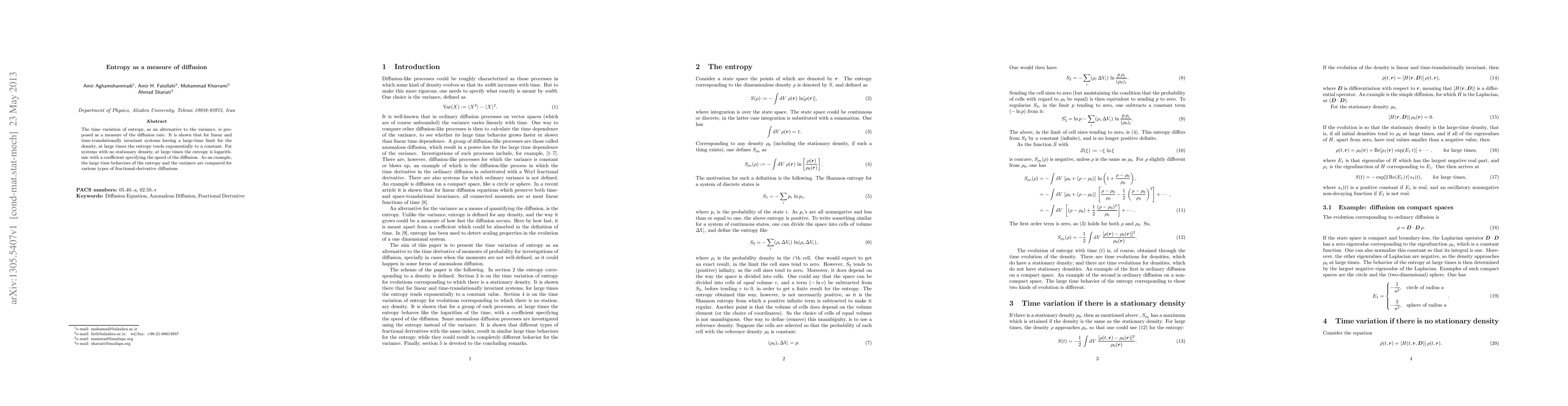 The time variation of entropy, as an alternative to the variance, is proposed as a measure of the diffusion rate. It is shown that for linear and time-translationally invariant systems having a large-time limit for the density, at large times the entropy tends exponentially to a constant. For systems with no stationary density, at large times the entropy is logarithmic with a coefficient specifying the speed of the diffusion. As an example, the large time behaviors of the entropy and the variance are compared for various types of fractional-derivative diffusions.