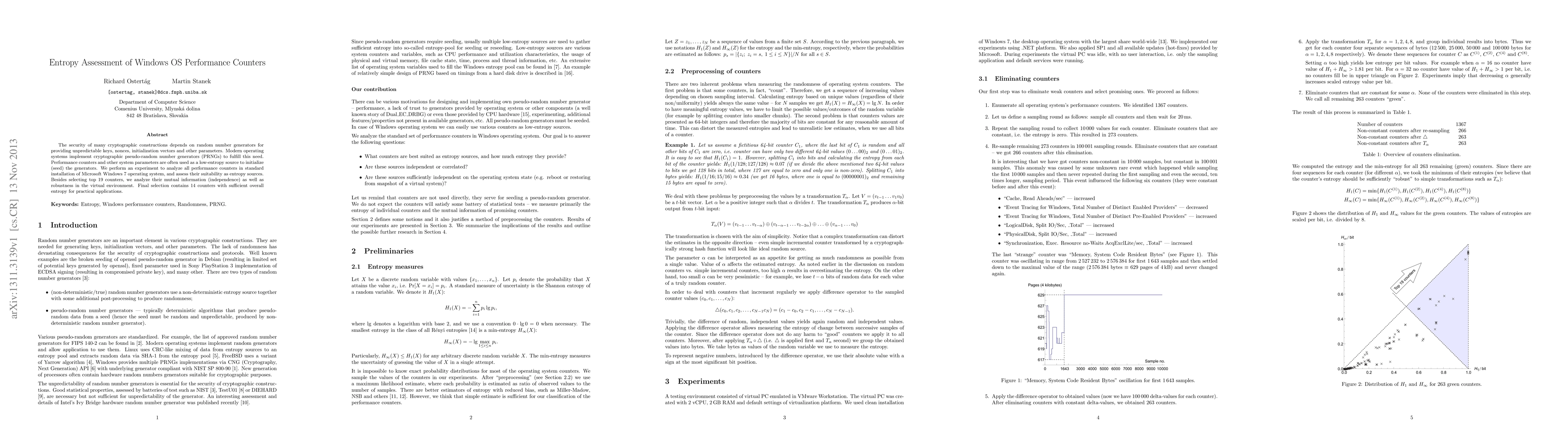 The security of many cryptographic constructions depends on random number generators for providing unpredictable keys, nonces, initialization vectors and other parameters. Modern operating systems implement cryptographic pseudo-random number generators (PRNGs) to fulfill this need. Performance counters and other system parameters are often used as a low-entropy source to initialize (seed) the generators. We perform an experiment to analyze all performance counters in standard installation of Microsoft Windows 7 operating system, and assess their suitability as entropy sources. Besides selecting top 19 counters, we analyze their mutual information (independence) as well as robustness in the virtual environment. Final selection contains 14 counters with sufficient overall entropy for practical applications.