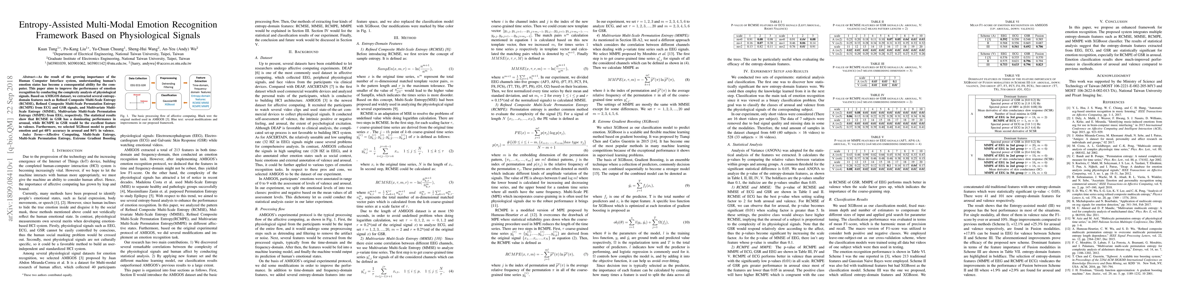 This paper proposes an entropy-assisted framework for multi-modal emotion recognition using physiological signals, extracting features like RCMSE and RCMPE from ECG and GSR. The XGBoost model achieved 68% accuracy for arousal and 84% for valence, demonstrating the effectiveness of entropy-based features.