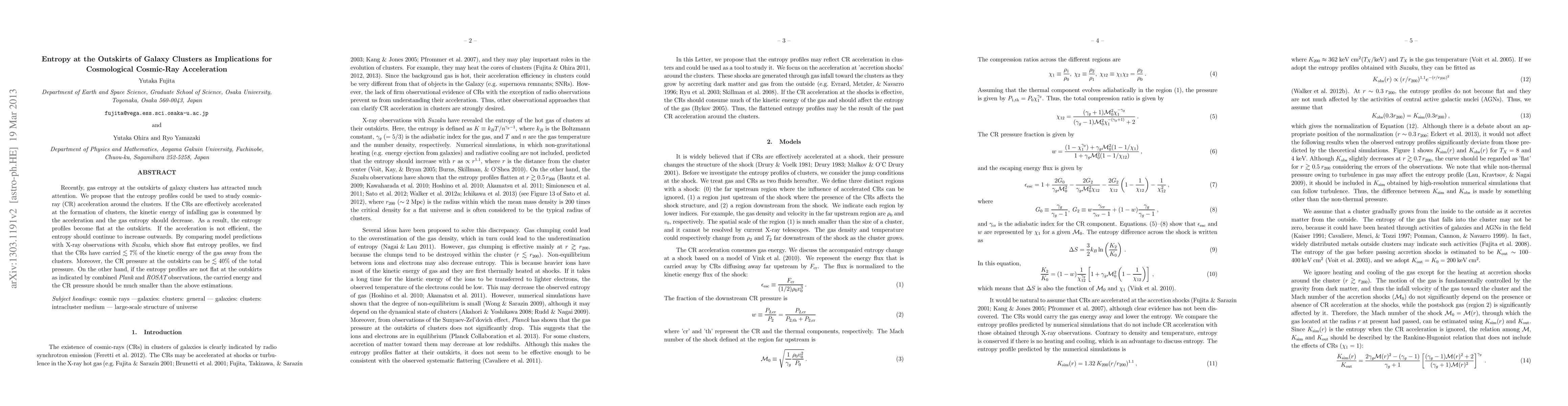 This paper investigates the entropy profiles at the outskirts of galaxy clusters to infer cosmic-ray acceleration efficiency. It finds that flat entropy profiles suggest cosmic rays have carried away less than 7% of the gas's kinetic energy, with their pressure making up less than 40% of the total pressure.