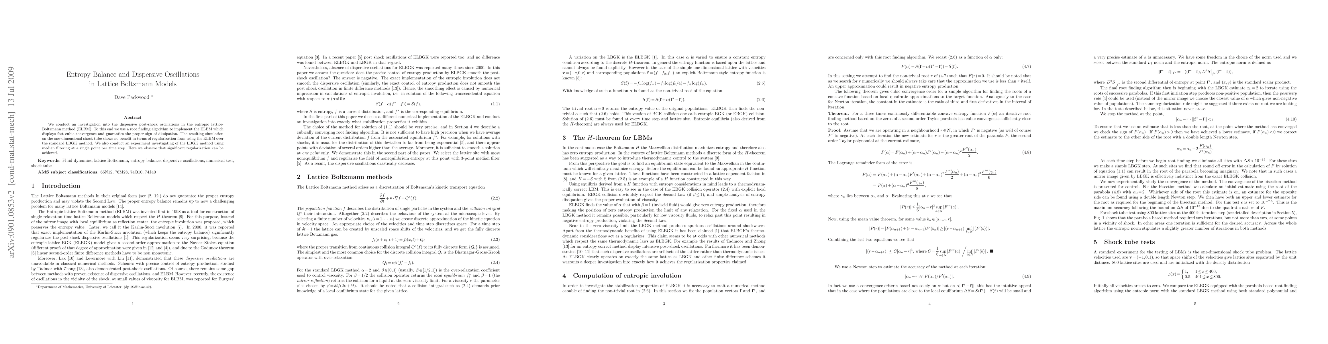We conduct an investigation into the dispersive post-shock oscillations in the entropic lattice-Boltzmann method (ELBM). To this end we use a root finding algorithm to implement the ELBM which displays fast cubic convergence and guaranties the proper sign of dissipation. The resulting simulation on the one-dimensional shock tube shows no benefit in terms of regularization from using the ELBM over the standard LBGK method. We also conduct an experiment investigating of the LBGK method using median filtering at a single point per time step. Here we observe that significant regularization can be achieved.