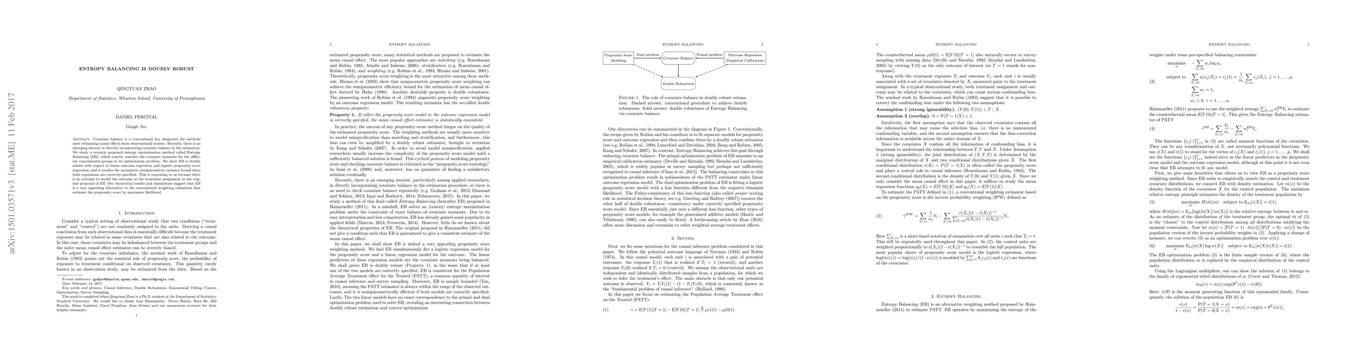 Entropy Balancing (EB) achieves covariate balance by maximizing entropy, and it is shown to be doubly robust with respect to linear and logistic regressions. EB reaches the asymptotic semiparametric variance bound when both regressions are correctly specified, making it a strong alternative to traditional propensity score estimators.