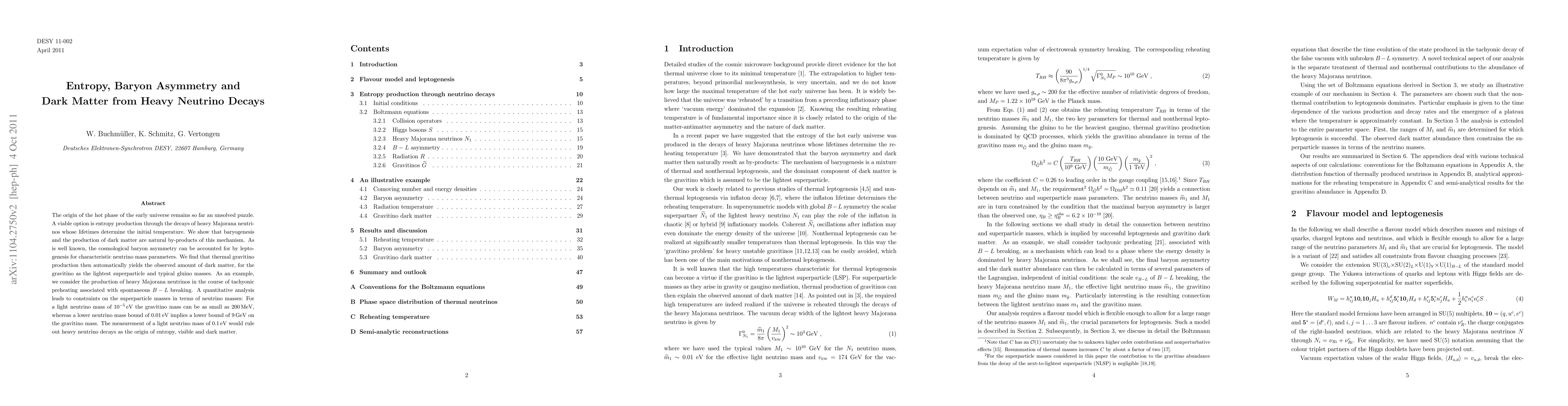 This paper explores how entropy production from heavy Majorana neutrino decays can explain the early universe's hot phase, generating both baryon asymmetry and dark matter. It finds that thermal gravitino production naturally yields the observed dark matter abundance, with constraints on gravitino and gluino masses derived from neutrino mass parameters.