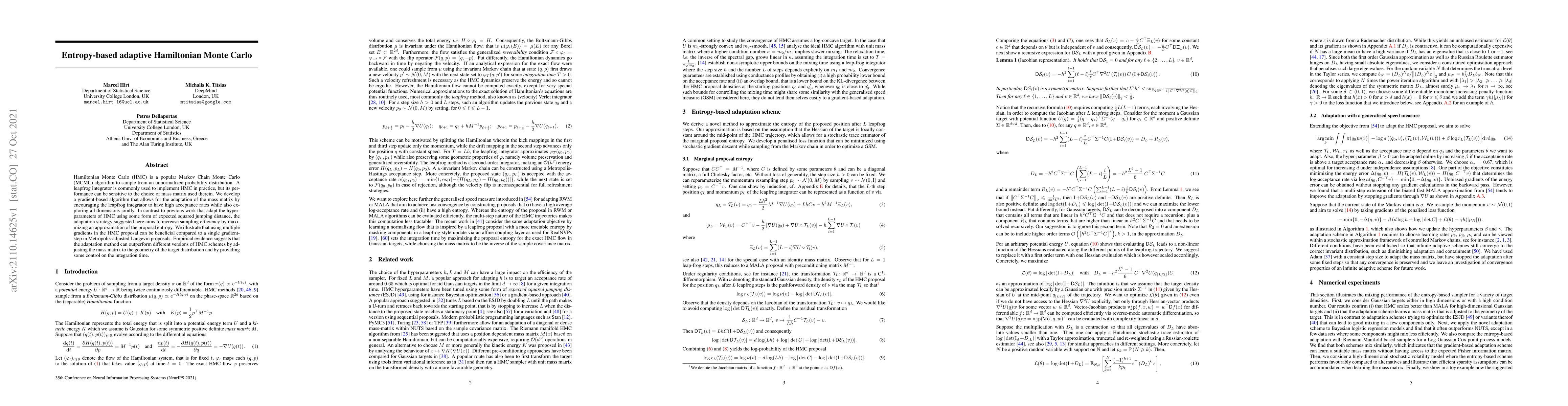 Hamiltonian Monte Carlo (HMC) is a popular Markov Chain Monte Carlo (MCMC) algorithm to sample from an unnormalized probability distribution. A leapfrog integrator is commonly used to implement HMC in practice, but its performance can be sensitive to the choice of mass matrix used therein. We develop a gradient-based algorithm that allows for the adaptation of the mass matrix by encouraging the leapfrog integrator to have high acceptance rates while also exploring all dimensions jointly. In contrast to previous work that adapt the hyperparameters of HMC using some form of expected squared jumping distance, the adaptation strategy suggested here aims to increase sampling efficiency by maximizing an approximation of the proposal entropy. We illustrate that using multiple gradients in the HMC proposal can be beneficial compared to a single gradient-step in Metropolis-adjusted Langevin proposals. Empirical evidence suggests that the adaptation method can outperform different versions of HMC schemes by adjusting the mass matrix to the geometry of the target distribution and by providing some control on the integration time.