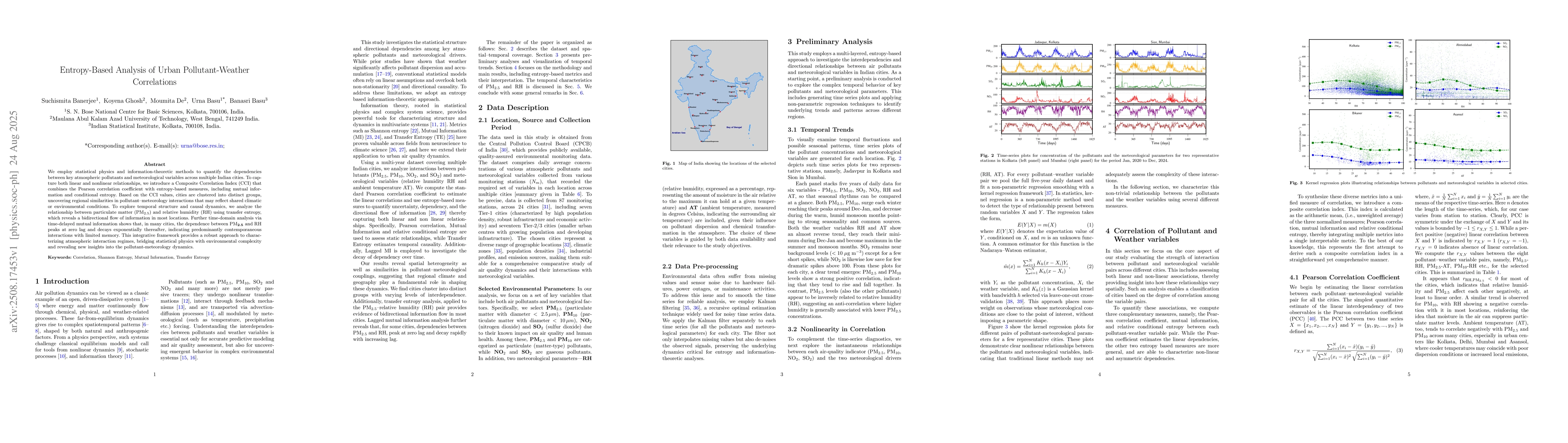 We employ statistical physics and information-theoretic methods to quantify the dependencies between key atmospheric pollutants and meteorological variables across multiple Indian cities. To capture both linear and nonlinear relationships, we introduce a Composite Correlation Index (CCI) that combines the Pearson correlation coefficient with entropy-based measures, including mutual information and conditional entropy. Based on the CCI values, cities are clustered into distinct groups, uncovering regional similarities in pollutant-meteorology interactions that may reflect shared climatic or environmental conditions. To explore temporal structure and causal dynamics, we analyze the relationship between particulate matter (PM2.5) and relative humidity (RH) using transfer entropy, which reveals a bidirectional flow of information in most locations. Further time-domain analysis via time-delayed mutual information shows that, in many cities, the dependence between PM2.5 and RH peaks at zero lag and decays exponentially thereafter, indicating predominantly contemporaneous interactions with limited memory. This integrative framework provides a robust approach to characterizing atmospheric interaction regimes, bridging statistical physics with environmental complexity and revealing new insights into the pollutant-meteorology dynamics.