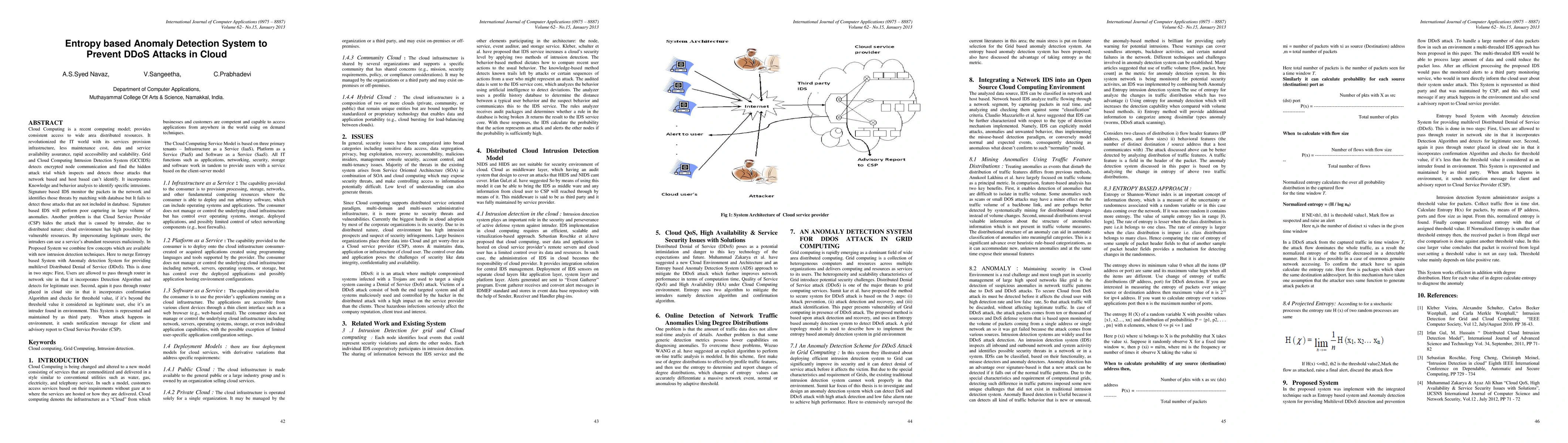 A new entropy-based anomaly detection system is proposed to prevent DDoS attacks in cloud computing environments, combining multiple techniques for effective multilevel protection.