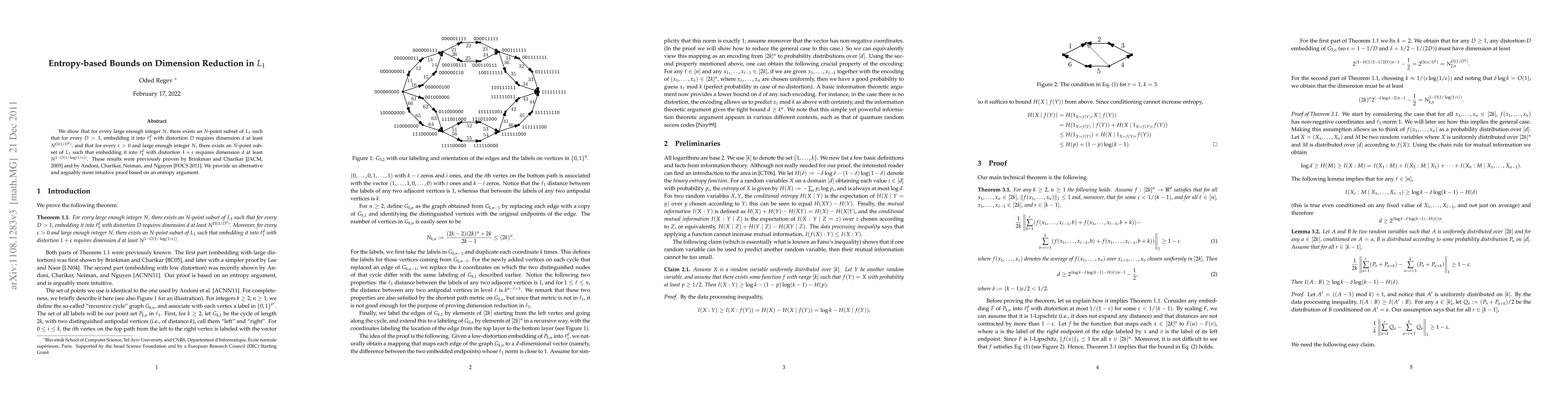 This paper presents entropy-based proofs for dimension reduction bounds in L_1 spaces, showing that high distortion embeddings require significantly larger dimensions, and provides a more intuitive alternative to previous proofs by Brinkman and Charikar and Andoni et al.