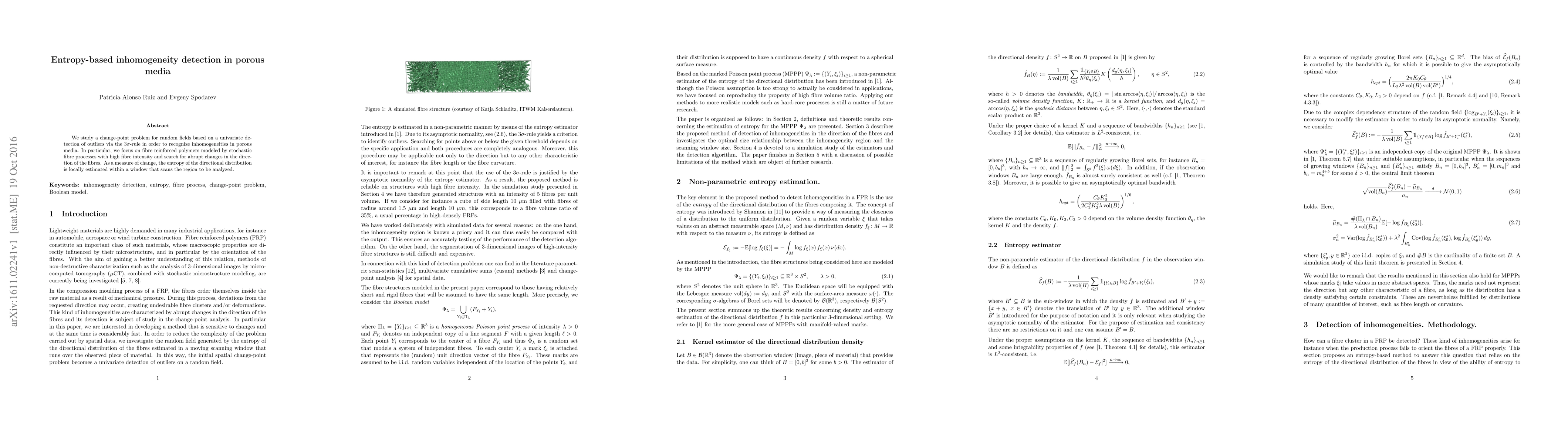 This paper proposes an entropy-based method for detecting inhomogeneities in fibre reinforced polymers by identifying abrupt changes in fibre direction using a $3\sigma$-rule. It employs local entropy estimation within a scanning window to pinpoint these changes.