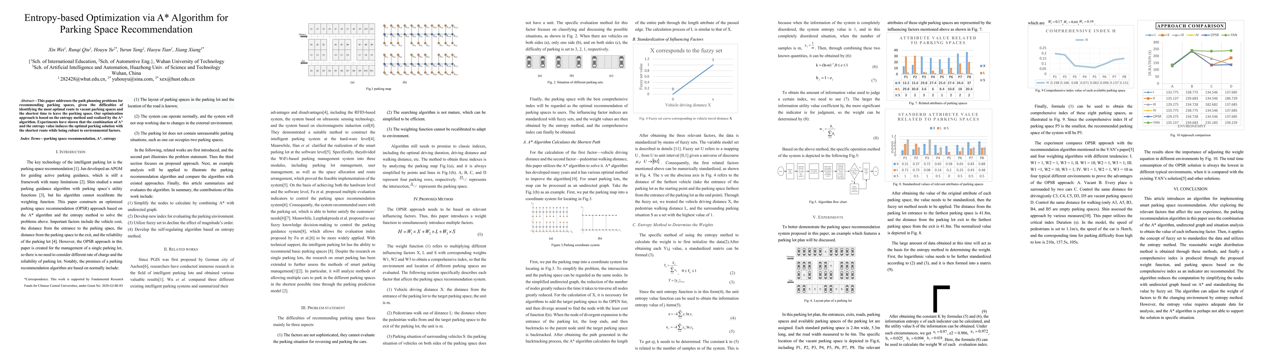 This paper proposes an entropy-based optimization method using the A* algorithm for efficient parking space recommendation, achieving optimal routes with minimal travel time and robustness to environmental changes. Experimental results demonstrate the effectiveness of the approach in finding the best parking solutions.