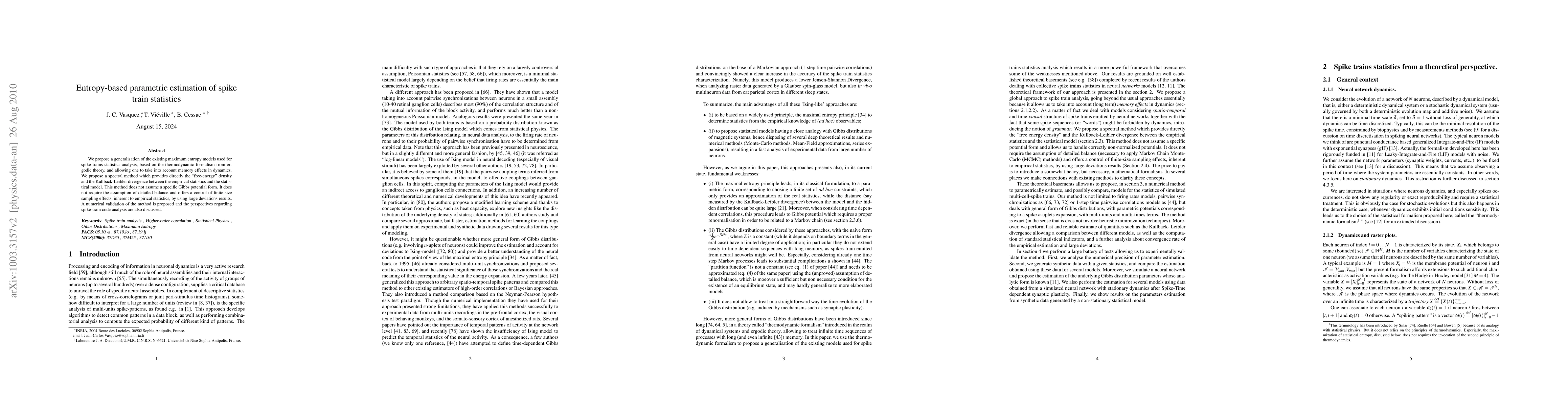 This paper proposes an entropy-based parametric estimation method for spike train statistics using thermodynamic formalism in ergodic theory, yielding a Gibbs distribution model. The method allows for fast computation of various spike observables and facilitates comparative analysis of neural codes.