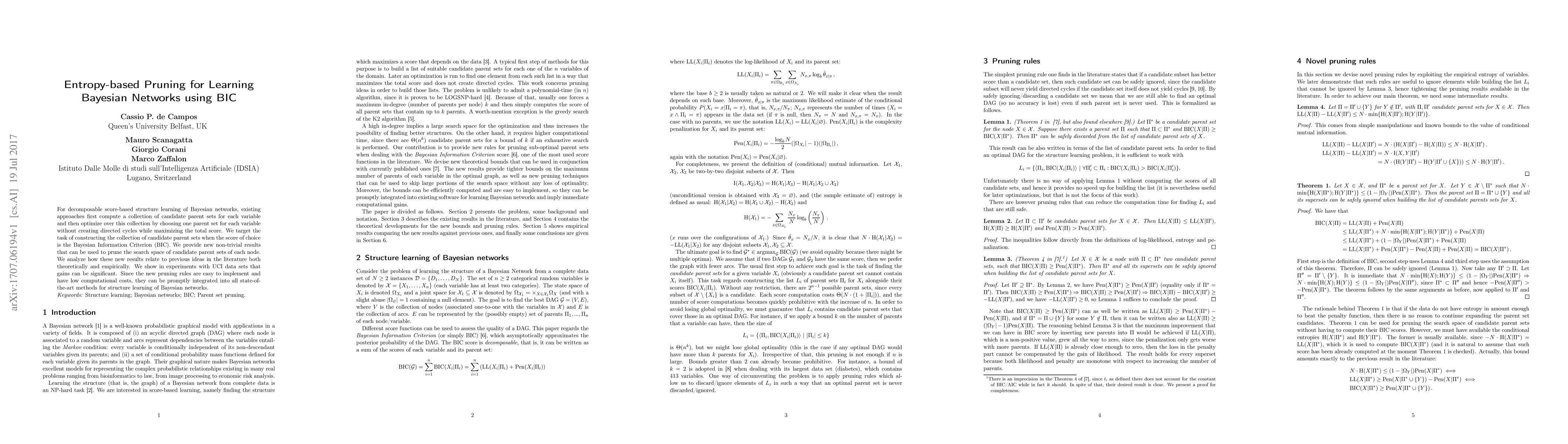 This paper introduces entropy-based pruning techniques to efficiently construct candidate parent sets for Bayesian networks using the Bayesian Information Criterion (BIC). The proposed methods significantly reduce the search space, leading to substantial computational gains, which are demonstrated through experiments on UCI datasets.