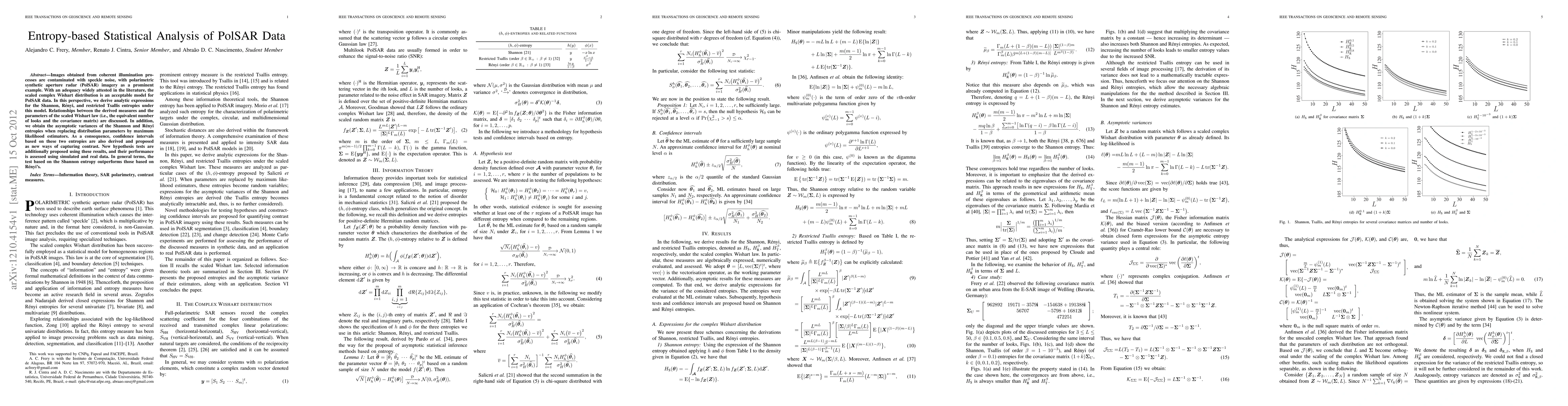 This paper develops entropy-based statistical methods for analyzing PolSAR data, deriving expressions for Shannon, Rényi, and Tsallis entropies under the scaled complex Wishart distribution. It also proposes confidence intervals and new hypothesis tests based on these entropies, showing that the Shannon entropy test performs better than the Rényi entropy test.