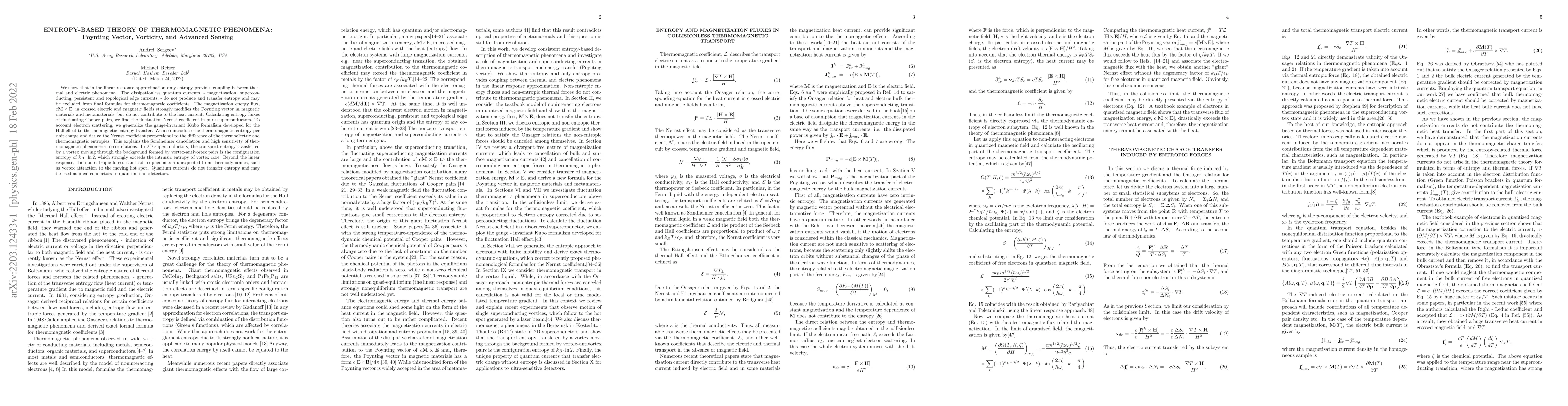 We show that in the linear response approximation only entropy provides coupling between thermal and electric phenomena. The dissipationless quantum currents -- magnetization, superconducting, persistent and topological edge currents -- do not produce and transfer entropy and may be excluded from final formulas for thermomagnetic coefficients. The magnetization energy flux, eM X E, in crossed electric and magnetic fields strongly modifies the Poynting vector in magnetic materials and metamaterials, but do not contribute to the heat current. Calculating entropy fluxes of fluctuating Cooper pairs, we find the fluctuation Nernst coefficient in pure superconductors. To account electron scattering, we generalize the gauge-invariant Kubo formalism developed for the Hall effect to thermomagnetic entropy transfer. We also introduce the thermomagnetic entropy per unit charge and derive the Nernst coefficient proportional to the difference of the thermoelectric and thermomagnetic entropies. This explains the Sondheimer cancellation and high sensitivity of thermomagnetic phenomena to correlations. In 2D superconductors, the transport entropy transferred by a vortex moving through the background formed by vortex-antivortex pairs is the configuration entropy of kB ln 2, which strongly exceeds the intrinsic entropy of vortex core. Beyond the linear response, the non-entropic forces can lead to phenomena unexpected from thermodynamics, such as vortex attraction to the moving hot spot. Quantum currents do not transfer entropy and may be used as ideal connectors to quantum nanodetectors.