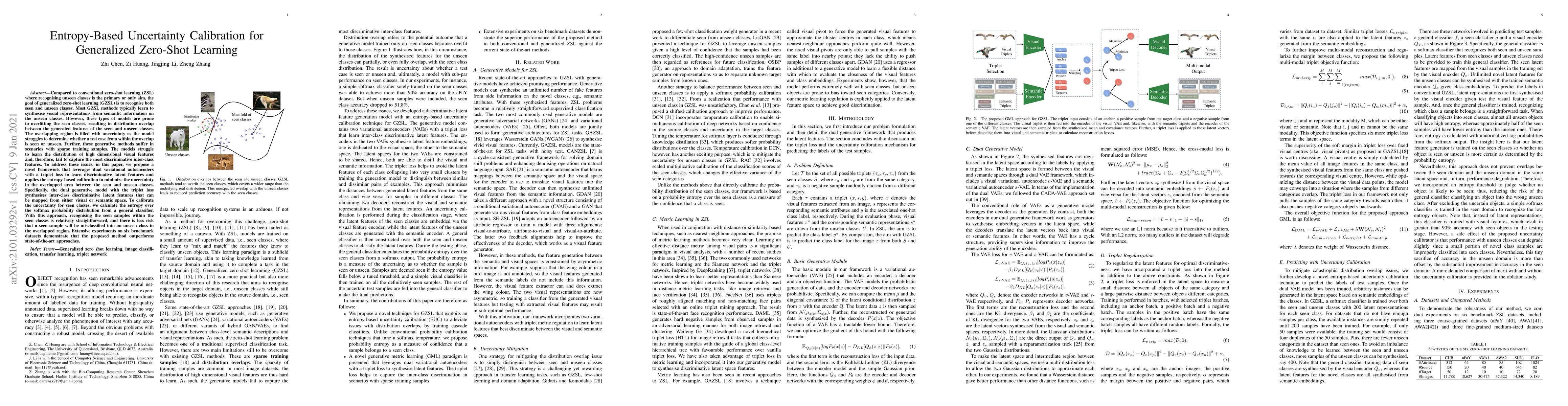 A new method for generalized zero-shot learning is proposed, which uses dual variational autoencoders with a triplet loss to learn discriminative features and entropy-based calibration to minimize uncertainty, outperforming state-of-the-art approaches.