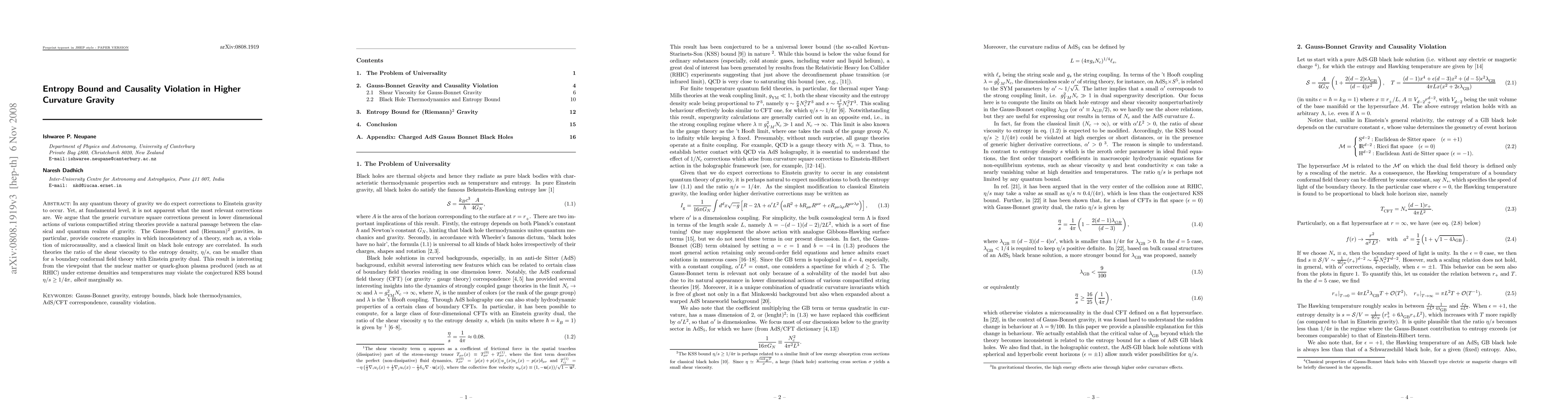 This paper explores how curvature square corrections in higher-dimensional gravity theories, such as Gauss-Bonnet and Riemann squared gravities, may lead to violations of microcausality and affect black hole entropy limits. It finds that these corrections can result in a lower ratio of shear viscosity to entropy density, potentially challenging the conjectured bound in extreme-density matter.