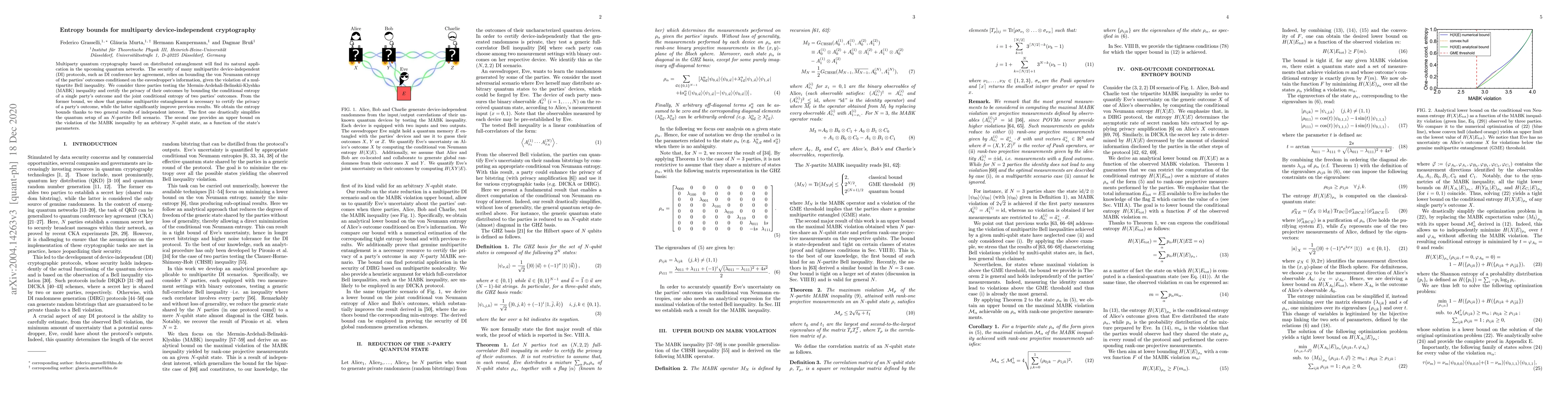 This paper establishes entropy bounds for multiparty device-independent quantum cryptography, focusing on the privacy of outcomes in three-party scenarios. It demonstrates that genuine multipartite entanglement is essential for certifying privacy and significantly improves previous results on joint conditional entropy bounds.
