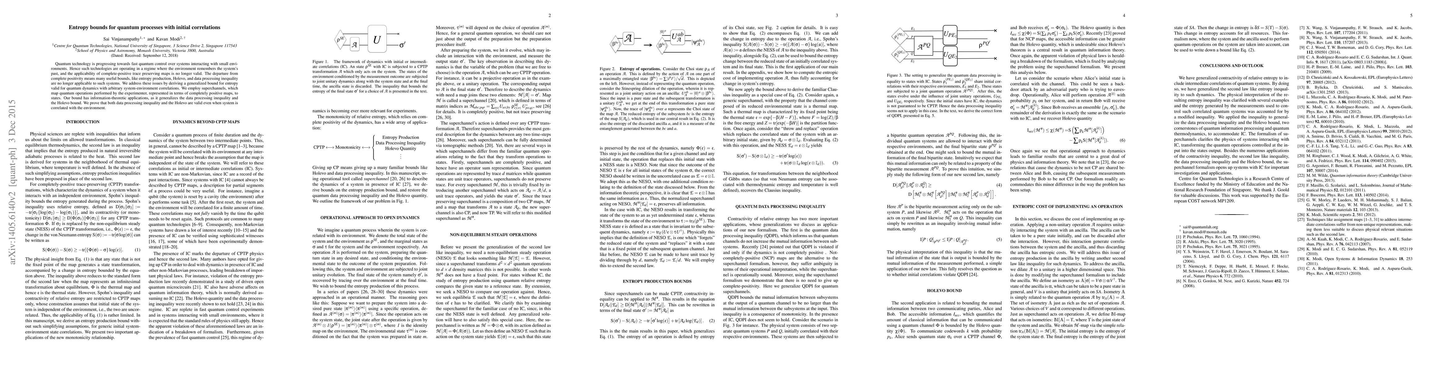 Quantum technology is progressing towards fast quantum control over systems interacting with small environments. Hence such technologies are operating in a regime where the environment remembers the system's past, and the applicability of complete-positive trace preserving maps is no longer valid. The departure from complete positivity means many useful bounds, like entropy production, Holevo, and data processing inequality are no longer applicable to such systems. We address these issues by deriving a generalized bound for entropy valid for quantum dynamics with arbitrary system-environment correlations. We employ superchannels, which map quantum operations performed by the experimenter, represented in terms of completely positive maps, to states. Our bound has information-theoretic applications, as it generalizes the data processing inequality and the Holevo bound. We prove that both data processing inequality and the Holevo are valid even when system is correlated with the environment.