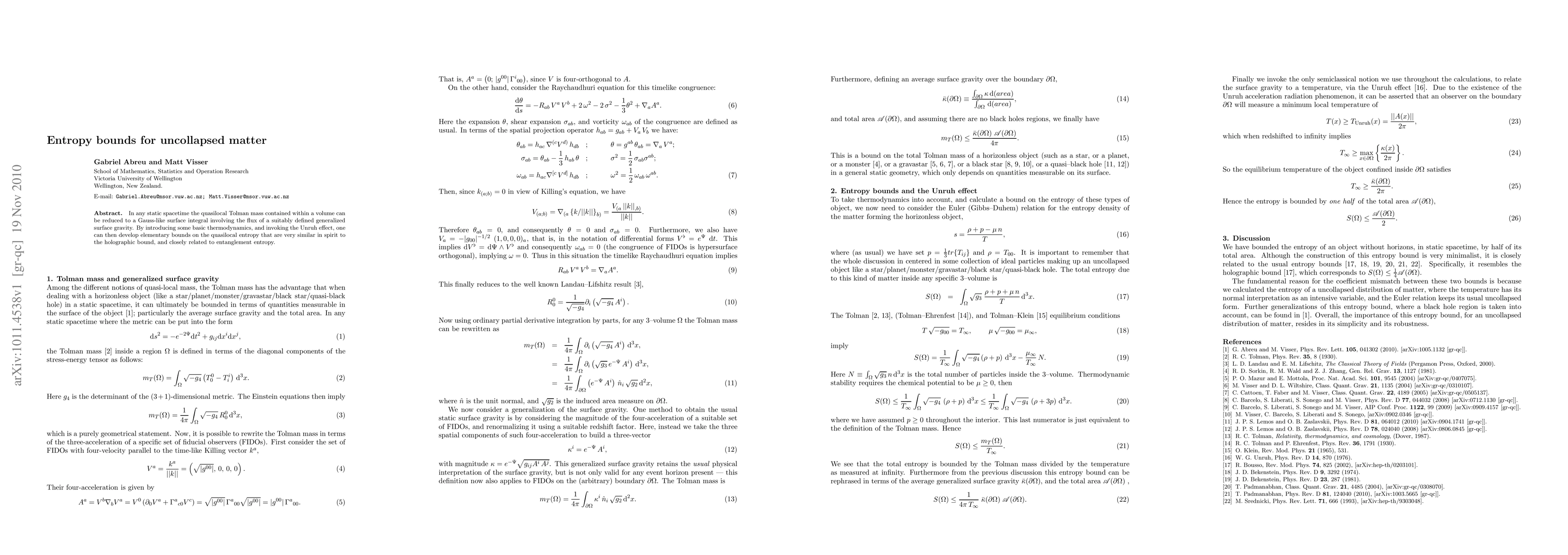 This paper establishes entropy bounds for uncollapsed matter in static spacetimes by linking quasilocal Tolman mass to a surface gravity integral, incorporating thermodynamic principles and the Unruh effect to derive bounds akin to the holographic principle, closely tied to entanglement entropy.