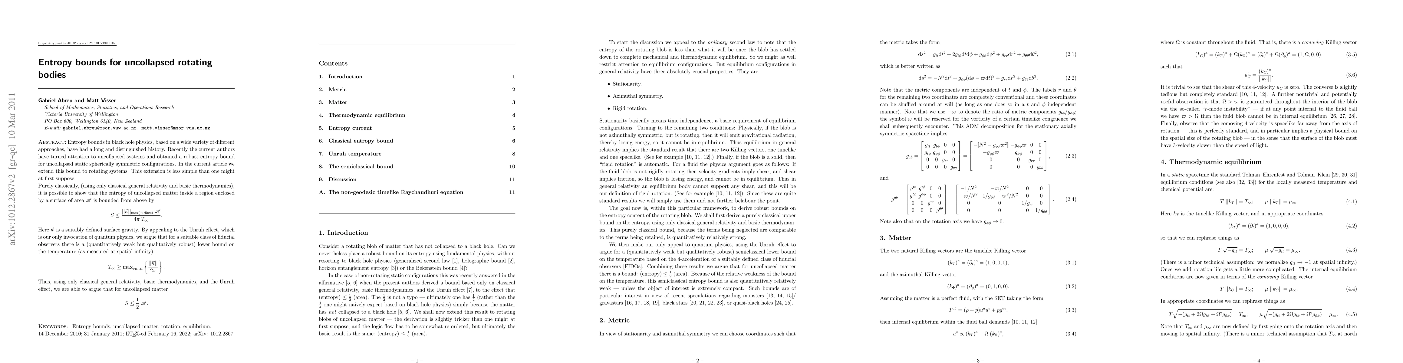 This paper extends entropy bounds for uncollapsed rotating bodies, showing that the entropy of uncollapsed matter is bounded by S <= {1/2} A using classical general relativity, basic thermodynamics, and the Unruh effect. It establishes a lower bound on temperature for a class of fiducial observers.