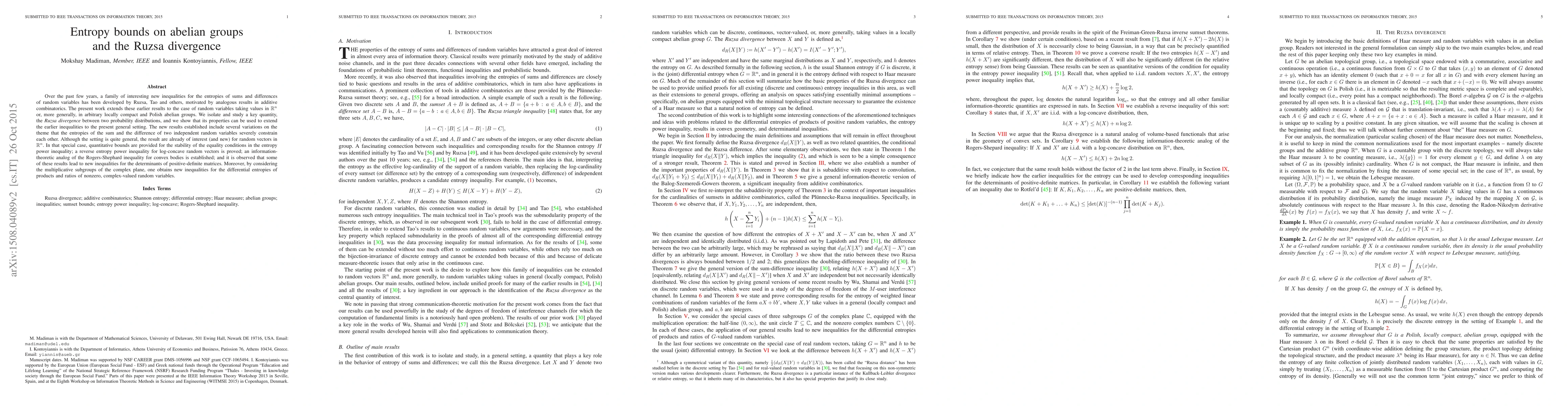 This paper extends entropy inequalities for sums and differences of random variables to locally compact and Polish abelian groups, introducing the Ruzsa divergence to analyze these relationships. It provides new bounds and inequalities for random vectors in $\mathbb{R}^n$ and complex-valued random variables, including stability conditions, reverse entropy power inequalities, and analogs of classical geometric inequalities.