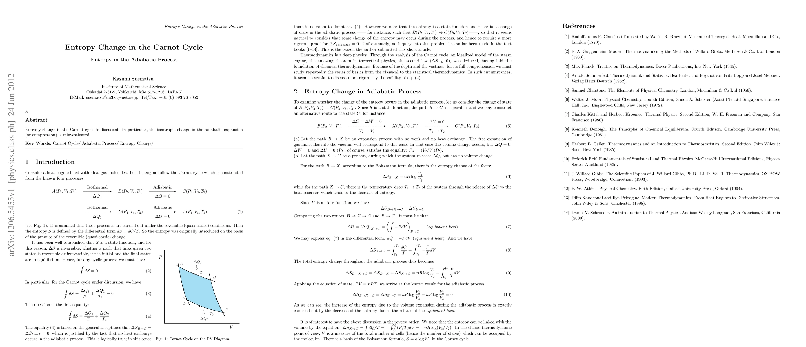 Entropy change in the Carnot cycle is discussed. In particular, the isentropic change in the adiabatic expansion (or compression) is reinvestigated.